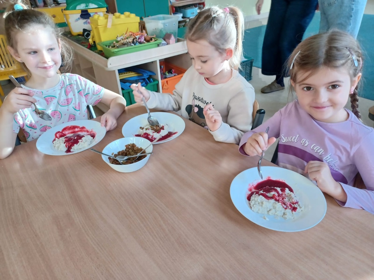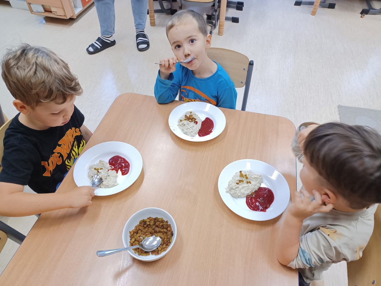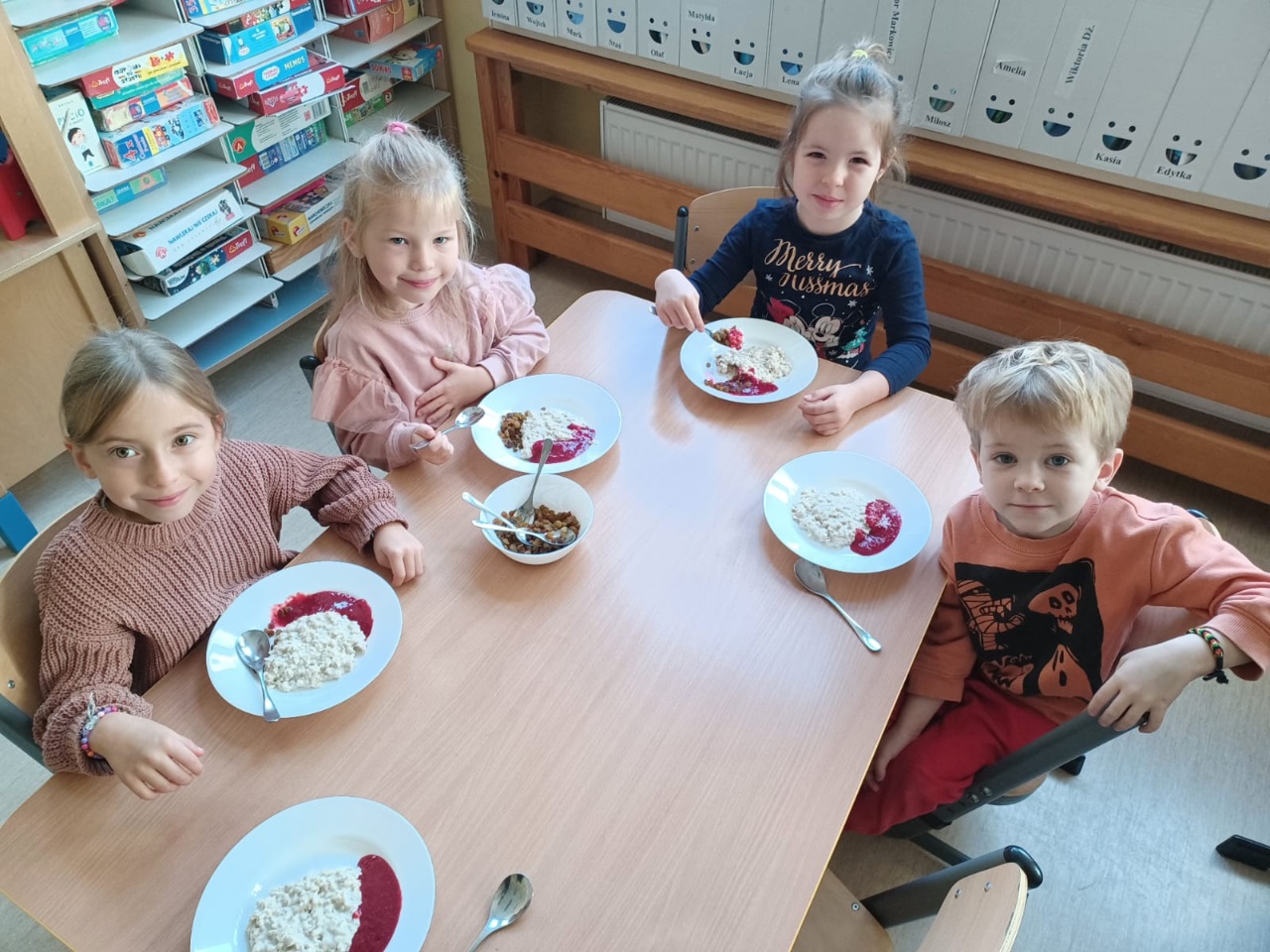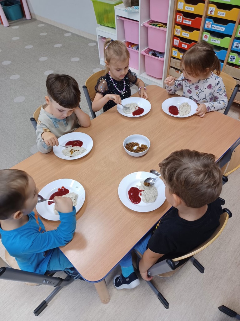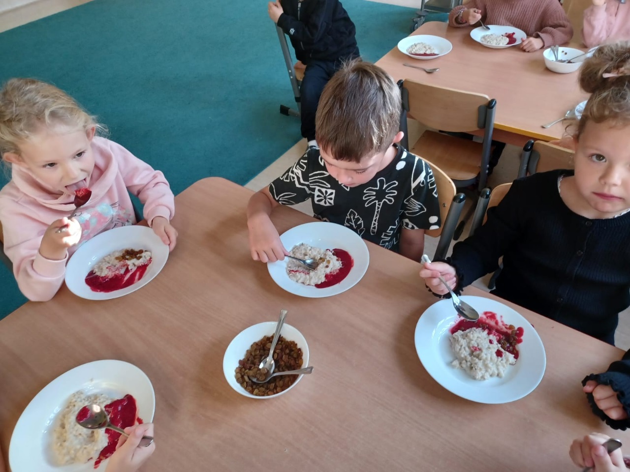 W naszym przedszkolu obchodziliśmy Dzień Owsianki. Dowiedzieliśmy się, że owsianka to bardzo zdrowe śniadanie. Daje nam dużo energii i pomaga dobrze zacząć dzień. Razem rozmawialiśmy o tym, z czym można jeść owsiankę. Dzieci mówiły, że lubią ją z bananem, jabłkiem, truskawkami albo miodem. Potem sami robiliśmy swoją własną owsiankę z sosem malinowym i rodzynkami. ,,Dzień Owsianki'' był nie tylko pysznym, ale i edukacyjnym doświadczeniem, które zachęciło dzieci do zdrowego odżywiania i samodzielności w kuchni.