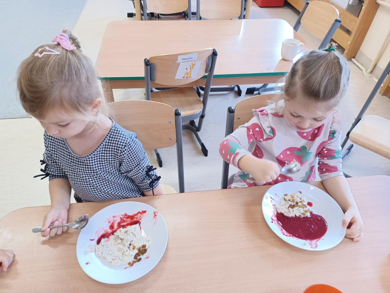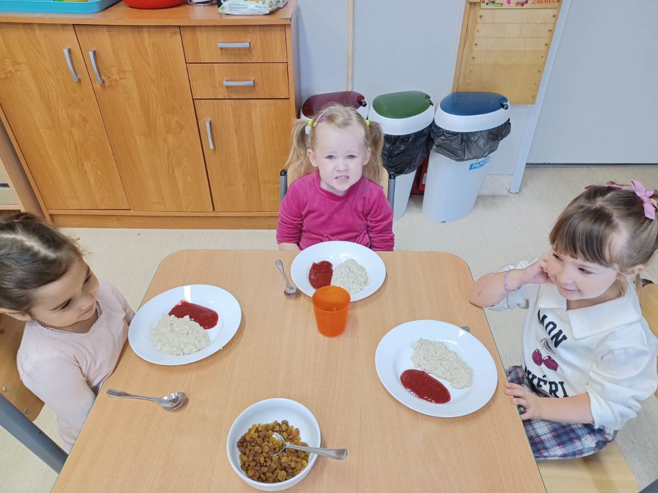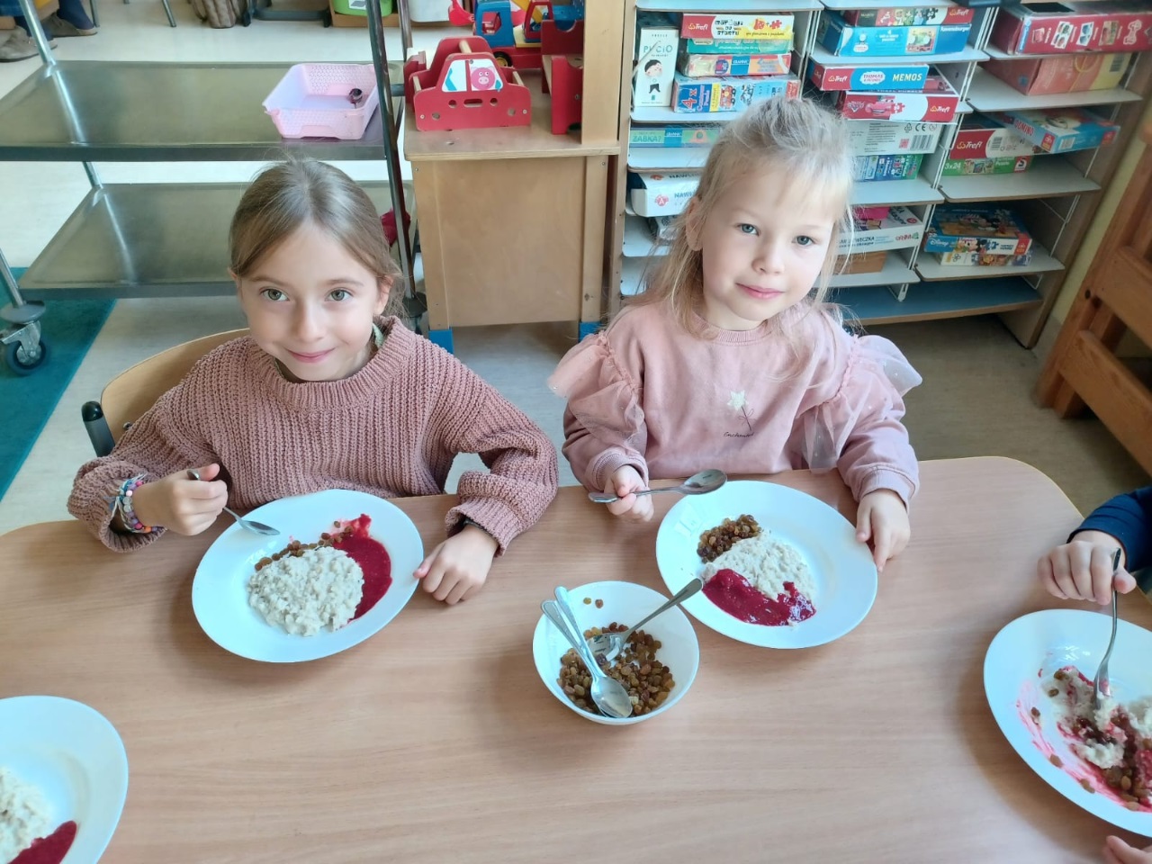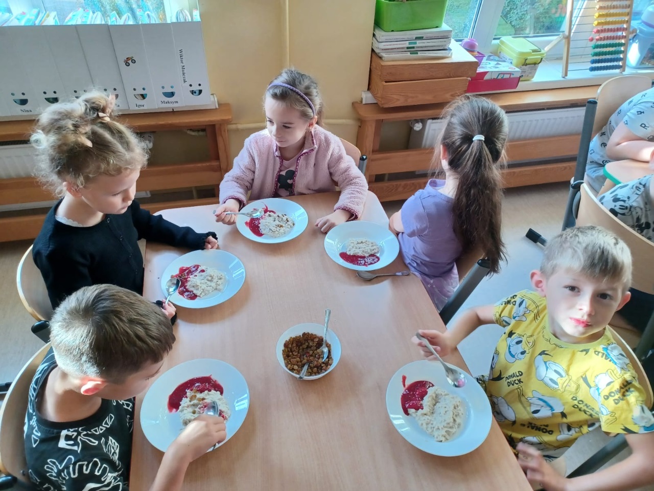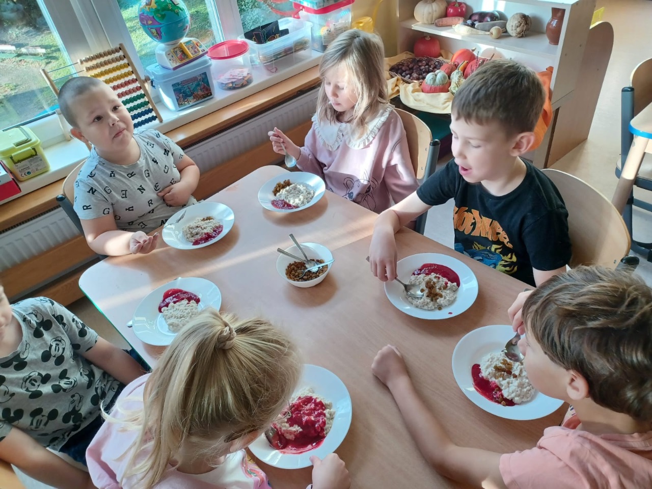 W naszym przedszkolu obchodziliśmy Dzień Owsianki. Dowiedzieliśmy się, że owsianka to bardzo zdrowe śniadanie. Daje nam dużo energii i pomaga dobrze zacząć dzień. Razem rozmawialiśmy o tym, z czym można jeść owsiankę. Dzieci mówiły, że lubią ją z bananem, jabłkiem, truskawkami albo miodem. Potem sami robiliśmy swoją własną owsiankę z sosem malinowym i rodzynkami. ,,Dzień Owsianki'' był nie tylko pysznym, ale i edukacyjnym doświadczeniem, które zachęciło dzieci do zdrowego odżywiania i samodzielności w kuchni.