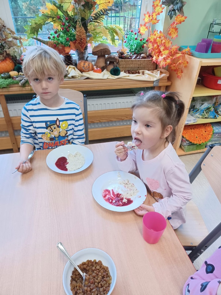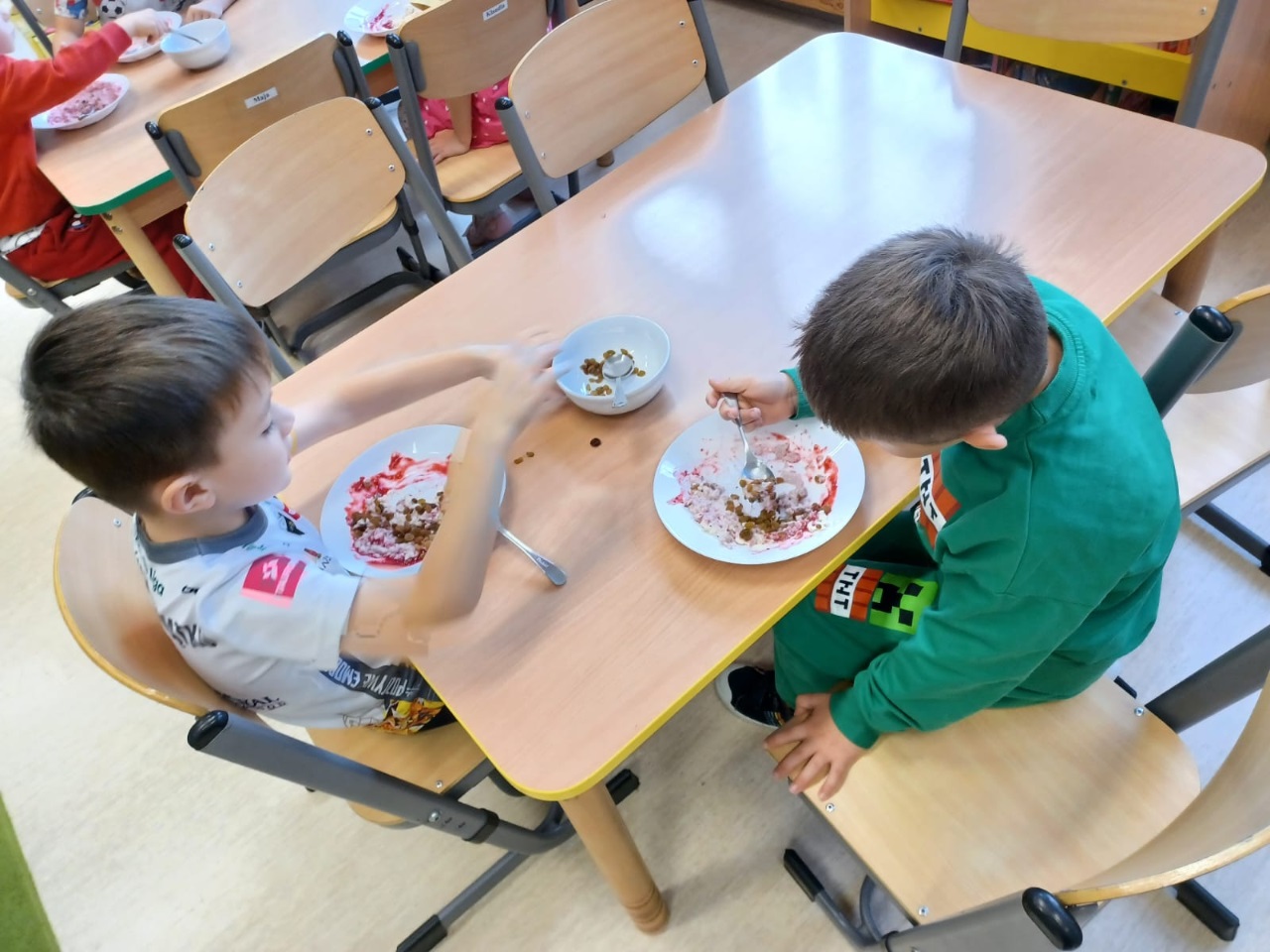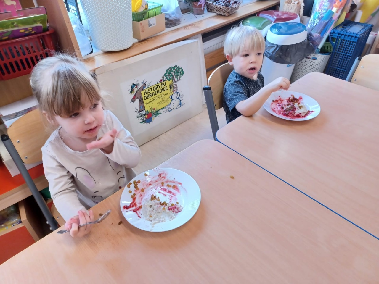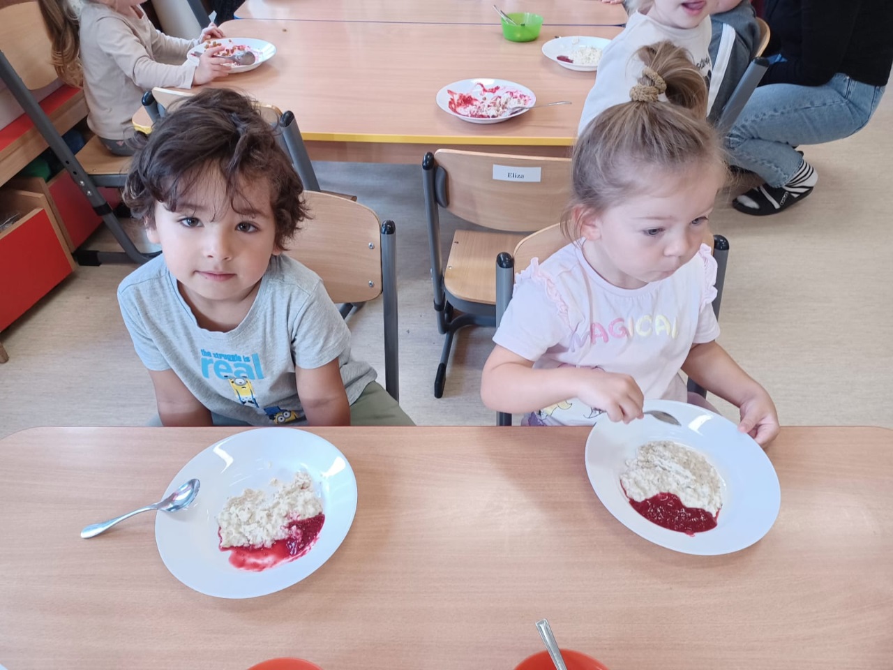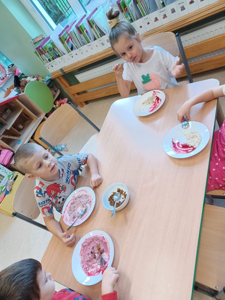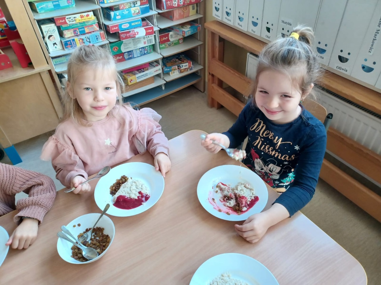 W naszym przedszkolu obchodziliśmy Dzień Owsianki. Dowiedzieliśmy się, że owsianka to bardzo zdrowe śniadanie. Daje nam dużo energii i pomaga dobrze zacząć dzień. Razem rozmawialiśmy o tym, z czym można jeść owsiankę. Dzieci mówiły, że lubią ją z bananem, jabłkiem, truskawkami albo miodem. Potem sami robiliśmy swoją własną owsiankę z sosem malinowym i rodzynkami. ,,Dzień Owsianki'' był nie tylko pysznym, ale i edukacyjnym doświadczeniem, które zachęciło dzieci do zdrowego odżywiania i samodzielności w kuchni.