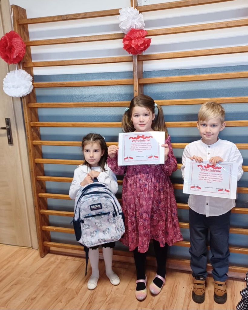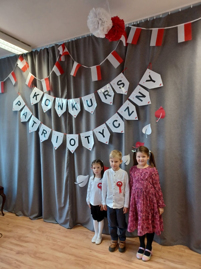 W Przedszkolu nr 46 „Muszelka” w Gdańsku odbył się międzyprzedszkolny konkurs recytatorski ,,Mały Patriota'' dla przedszkolaków, w którym wzięły udział dzieci z pięciu gdańskich placówek. Nasze przedszkole dumnie reprezentowali: Dominika i Oliwier z grupy Elfów oraz Irmina z grupy Koszaki Opałki. Z ogromną radością informujemy, że Dominika zdobyła I miejsce, która zachwyciła jury swoją interpretacją wiersza, piękną dykcją oraz sceniczną odwagą. To wspaniały sukces, który jest powodem do dumy zarówno dla całej społeczności przedszkolnej. Serdecznie gratulujemy naszym małym aktorom odwagi, pięknych występów i wspaniałego zaangażowania oraz dziękujemy za godne reprezentowanie naszego przedszkola.