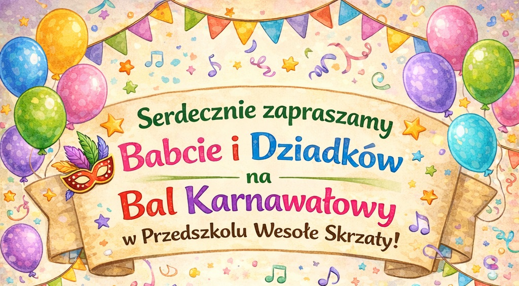 Na Bal Karnawałowy zapraszamy wyłącznie Babcie i Dziadków wraz z dziećmi uczęszczającymi do naszego przedszkola.