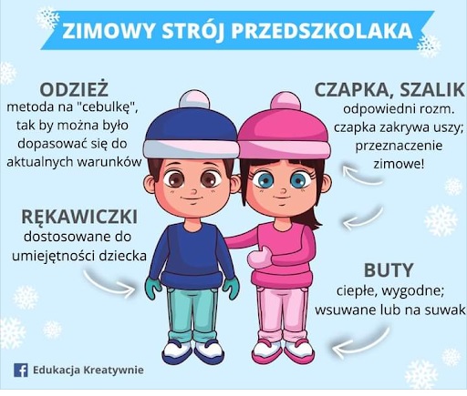 W związku z aktualnymi warunkami atmosferycznymi, przypominamy o ubieraniu dzieci adekwatnie do pogody. Mile widziane kombinezony na śnieg, odpowiednie buty do zabaw na śniegu, czapki, szaliki i rękawiczki z jednym palcem. W szatni warto też zostawić więcej ubranek na przebranie. Dzięki odpowiednim ubraniom, dzieci będą mogły więcej czasu spędzać na spacerach i zabawach na dworze. Dodatkowo prosimy zwrócić uwagę, aby nie przegrzewać dziecka w Sali. Dziękujemy :)
