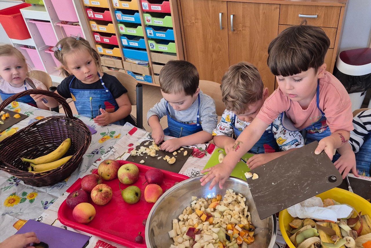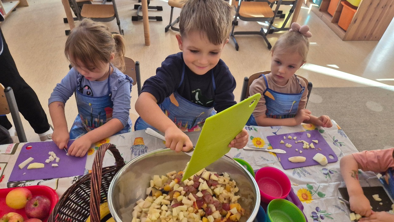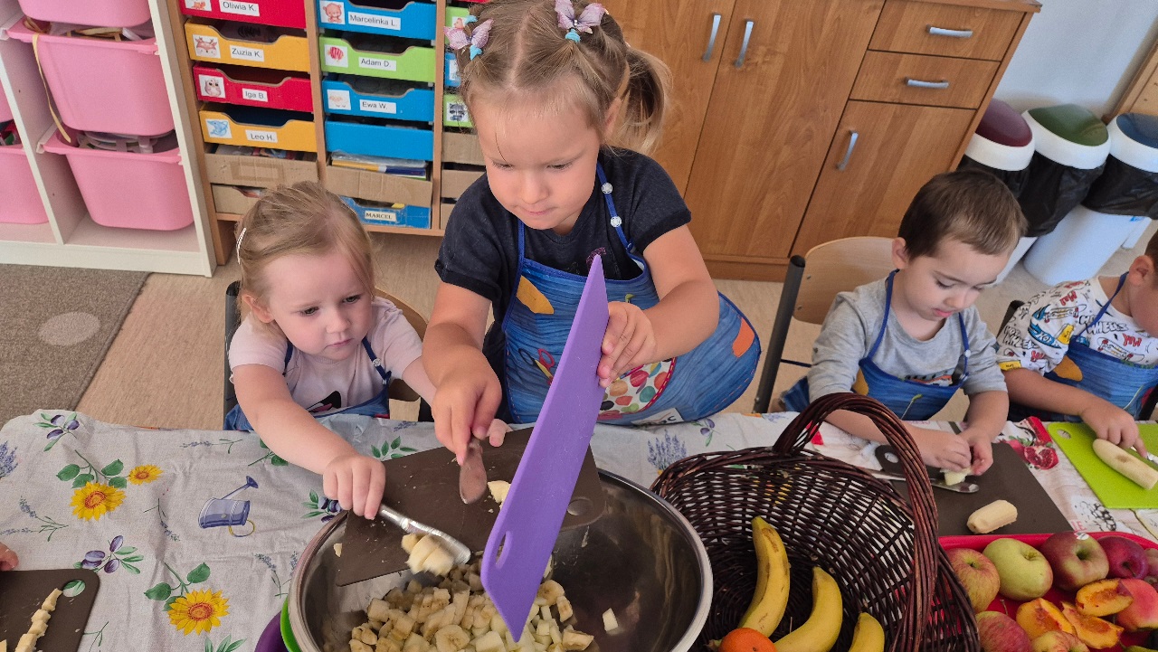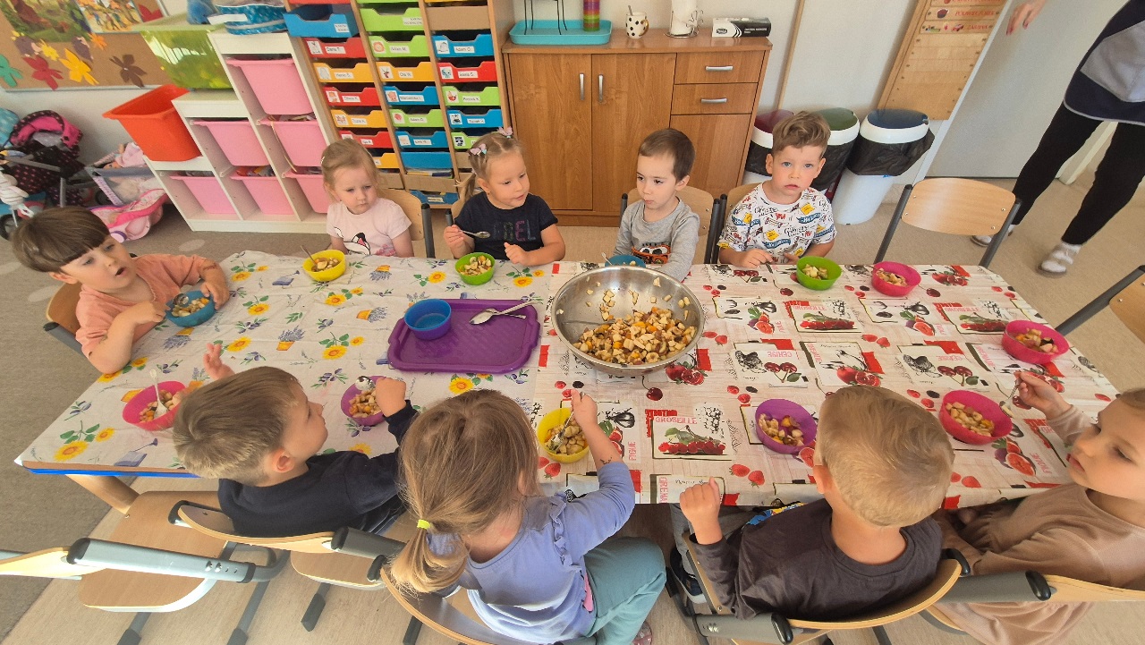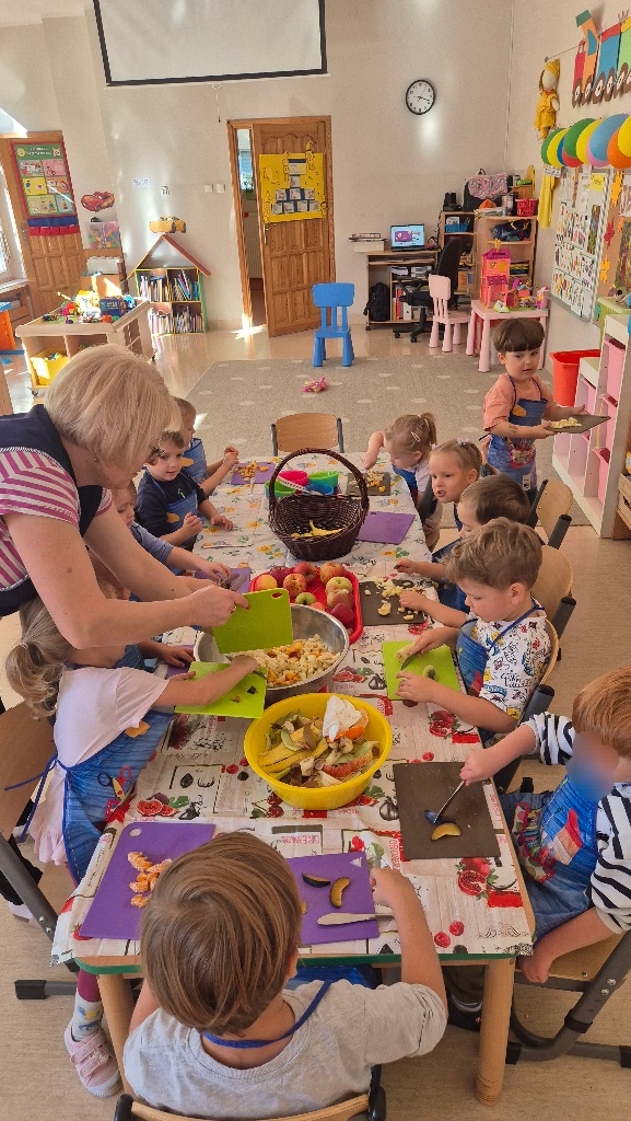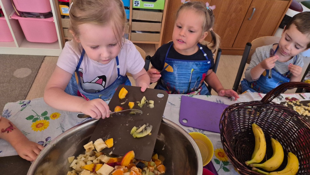 Nasze chochlikowe przedszkolaki zamieniły się w prawdziwych małych kucharzy. Podczas zajęć kulinarnych dzieci z wielkim zaangażowaniem przygotowywały pyszną i zdrową sałatkę owocową. Na początku dzieci zapoznały się z przyniesionymi owocami – wspólnie rozpoznawaliśmy ich nazwy, kolory, kształty i zapachy. Wśród owoców znalazły się m.in.: jabłka, gruszki, banany, winogrona, śliwki i mandarynki. Każdy przedszkolak miał okazję dotknąć i powąchać owoce, a także wypowiedzieć się, które z nich najbardziej lubi. Po umyciu rąk i założeniu fartuszków, dzieci przystąpiły do krojenia przygotowanych owoców (oczywiście z pomocą nauczycieli i przy użyciu bezpiecznych nożyków). Wszystkie pokrojone owoce zostały wrzucone do jednej dużej miski, a następnie delikatnie wymieszane. Na zakończenie nastąpił najprzyjemniejszy moment – degustacja. 😋 Dzieci ze smakiem zjadły własnoręcznie przygotowaną sałatkę, poznając nie tylko nowe smaki, ale także ucząc się zasad zdrowego odżywiania. Zajęcia kulinarne były nie tylko doskonałą zabawą, ale również: rozwijały samodzielność i współpracę w grupie, uczyły dbania o higienę i bezpieczeństwo w kuchni, wzbogacały wiedzę o owocach i zdrowym stylu życia. To była pyszna i zdrowa lekcja, która wszystkim bardzo się podobała!