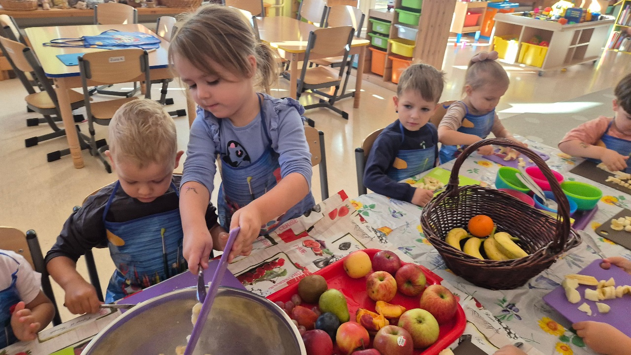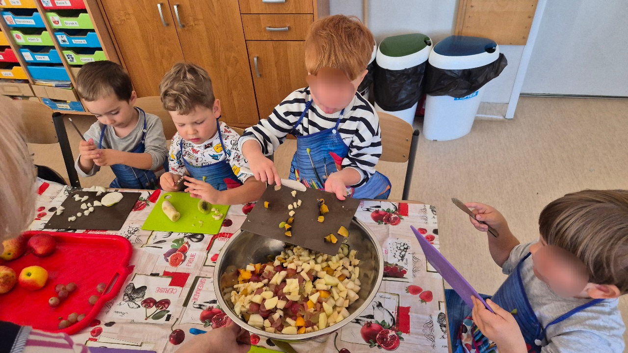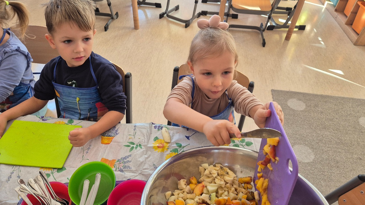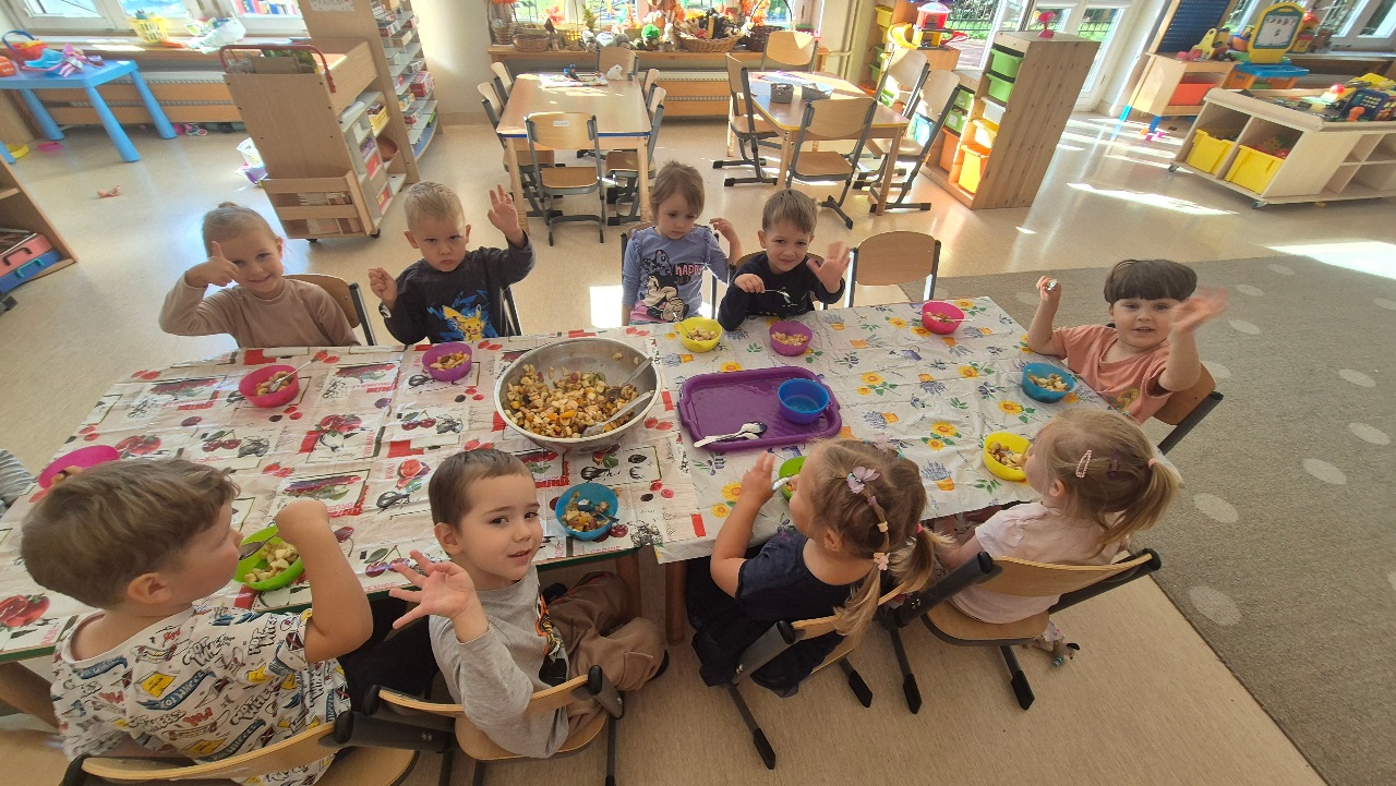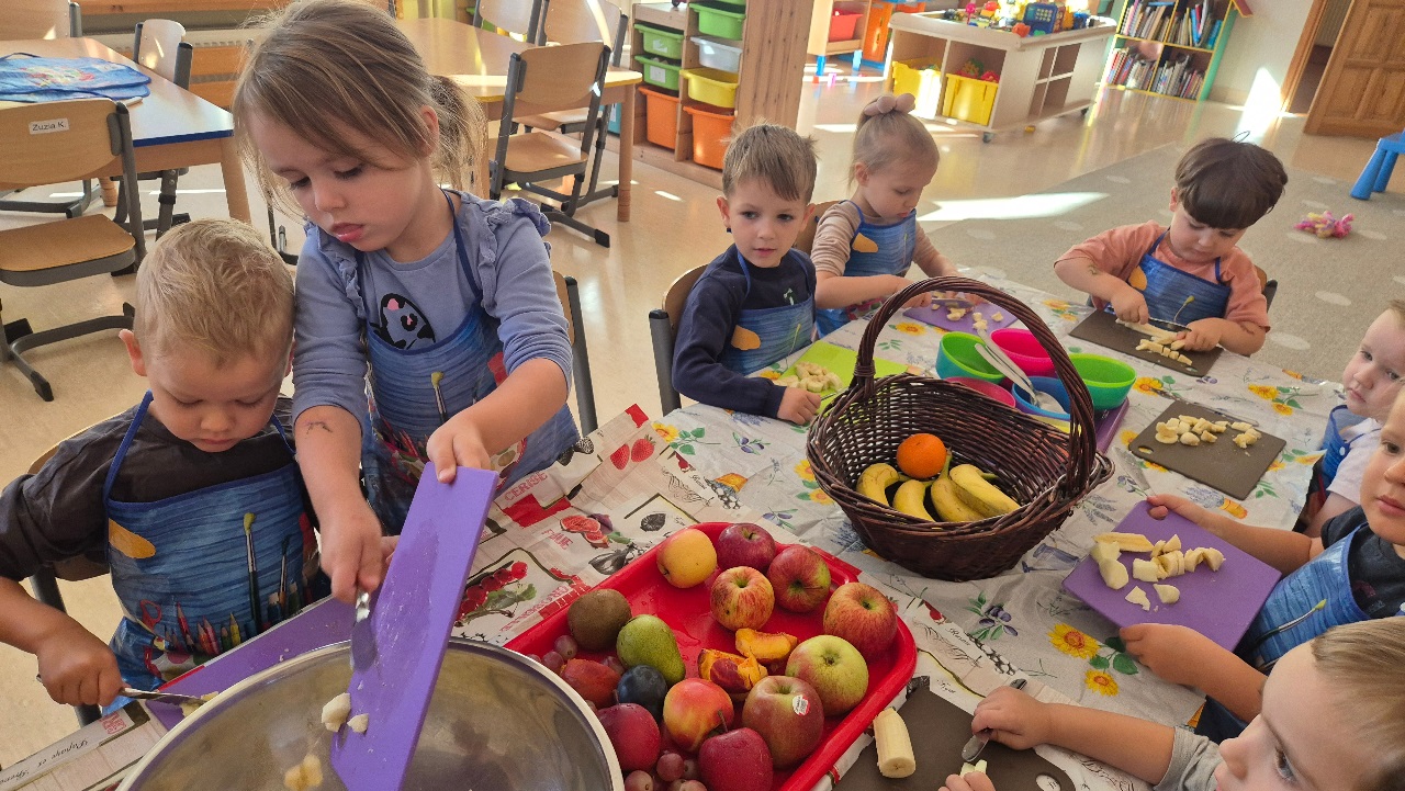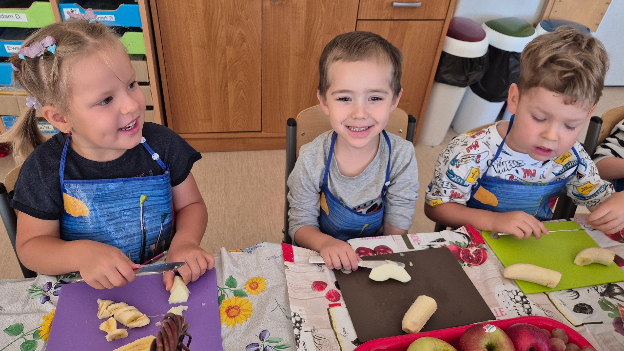 Nasze chochlikowe przedszkolaki zamieniły się w prawdziwych małych kucharzy. Podczas zajęć kulinarnych dzieci z wielkim zaangażowaniem przygotowywały pyszną i zdrową sałatkę owocową. Na początku dzieci zapoznały się z przyniesionymi owocami – wspólnie rozpoznawaliśmy ich nazwy, kolory, kształty i zapachy. Wśród owoców znalazły się m.in.: jabłka, gruszki, banany, winogrona, śliwki i mandarynki. Każdy przedszkolak miał okazję dotknąć i powąchać owoce, a także wypowiedzieć się, które z nich najbardziej lubi. Po umyciu rąk i założeniu fartuszków, dzieci przystąpiły do krojenia przygotowanych owoców (oczywiście z pomocą nauczycieli i przy użyciu bezpiecznych nożyków). Wszystkie pokrojone owoce zostały wrzucone do jednej dużej miski, a następnie delikatnie wymieszane. Na zakończenie nastąpił najprzyjemniejszy moment – degustacja. 😋 Dzieci ze smakiem zjadły własnoręcznie przygotowaną sałatkę, poznając nie tylko nowe smaki, ale także ucząc się zasad zdrowego odżywiania. Zajęcia kulinarne były nie tylko doskonałą zabawą, ale również: rozwijały samodzielność i współpracę w grupie, uczyły dbania o higienę i bezpieczeństwo w kuchni, wzbogacały wiedzę o owocach i zdrowym stylu życia. To była pyszna i zdrowa lekcja, która wszystkim bardzo się podobała!