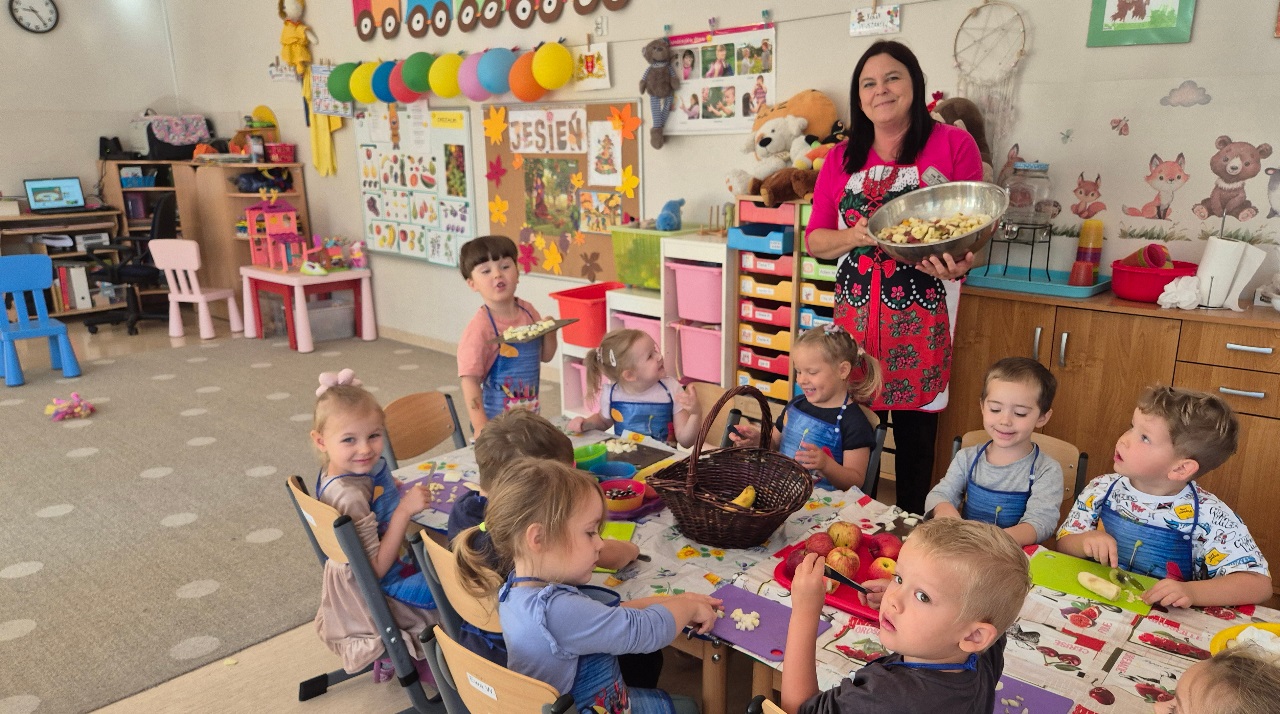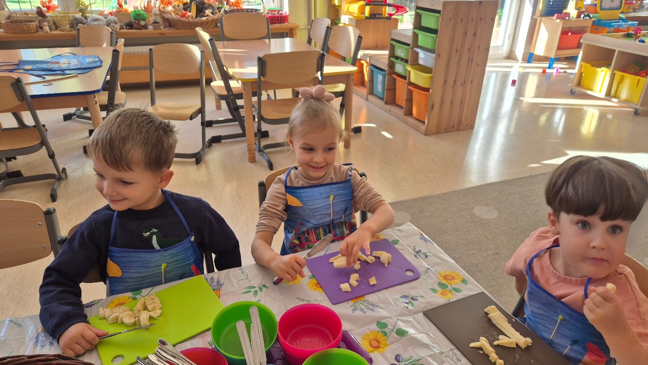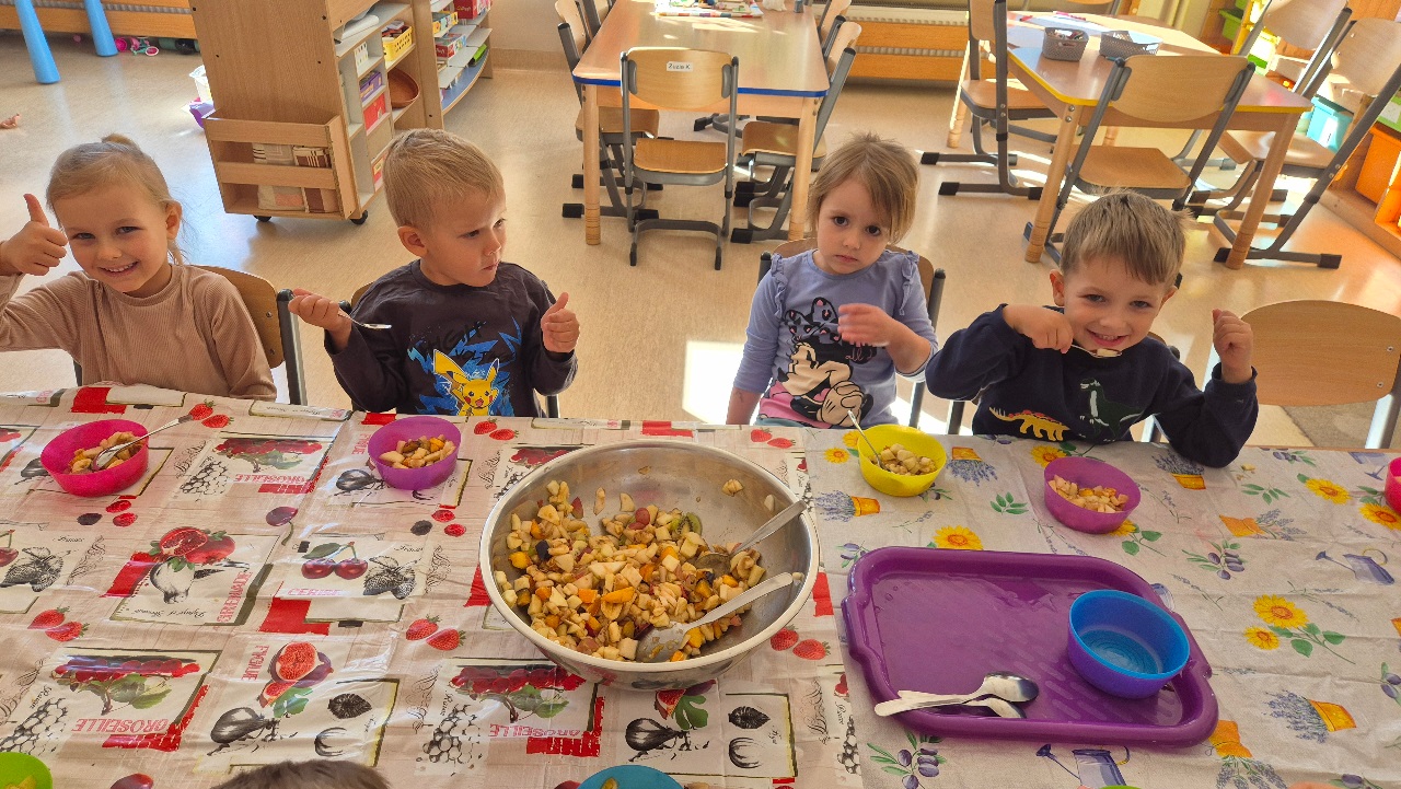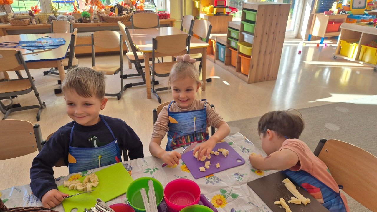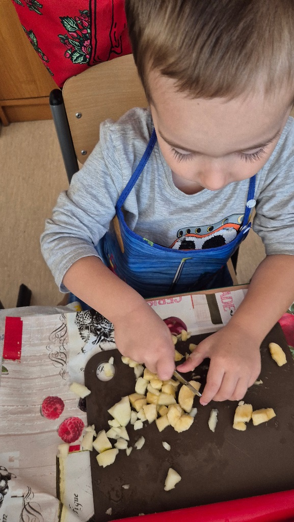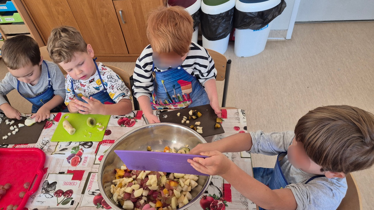 Nasze chochlikowe przedszkolaki zamieniły się w prawdziwych małych kucharzy. Podczas zajęć kulinarnych dzieci z wielkim zaangażowaniem przygotowywały pyszną i zdrową sałatkę owocową. Na początku dzieci zapoznały się z przyniesionymi owocami – wspólnie rozpoznawaliśmy ich nazwy, kolory, kształty i zapachy. Wśród owoców znalazły się m.in.: jabłka, gruszki, banany, winogrona, śliwki i mandarynki. Każdy przedszkolak miał okazję dotknąć i powąchać owoce, a także wypowiedzieć się, które z nich najbardziej lubi. Po umyciu rąk i założeniu fartuszków, dzieci przystąpiły do krojenia przygotowanych owoców (oczywiście z pomocą nauczycieli i przy użyciu bezpiecznych nożyków). Wszystkie pokrojone owoce zostały wrzucone do jednej dużej miski, a następnie delikatnie wymieszane. Na zakończenie nastąpił najprzyjemniejszy moment – degustacja. 😋 Dzieci ze smakiem zjadły własnoręcznie przygotowaną sałatkę, poznając nie tylko nowe smaki, ale także ucząc się zasad zdrowego odżywiania. Zajęcia kulinarne były nie tylko doskonałą zabawą, ale również: rozwijały samodzielność i współpracę w grupie, uczyły dbania o higienę i bezpieczeństwo w kuchni, wzbogacały wiedzę o owocach i zdrowym stylu życia. To była pyszna i zdrowa lekcja, która wszystkim bardzo się podobała!
