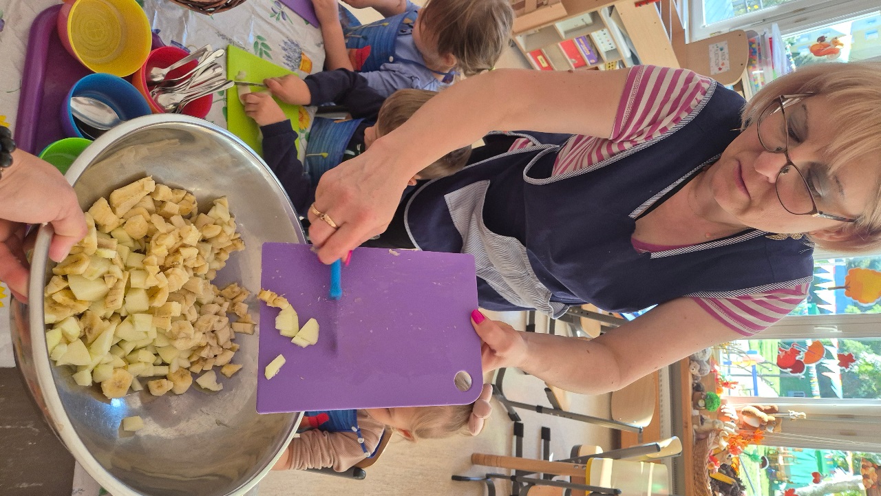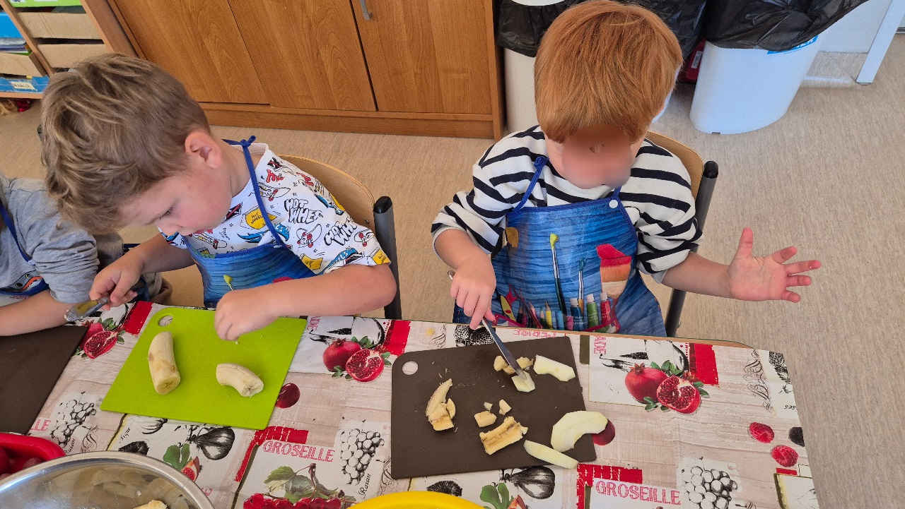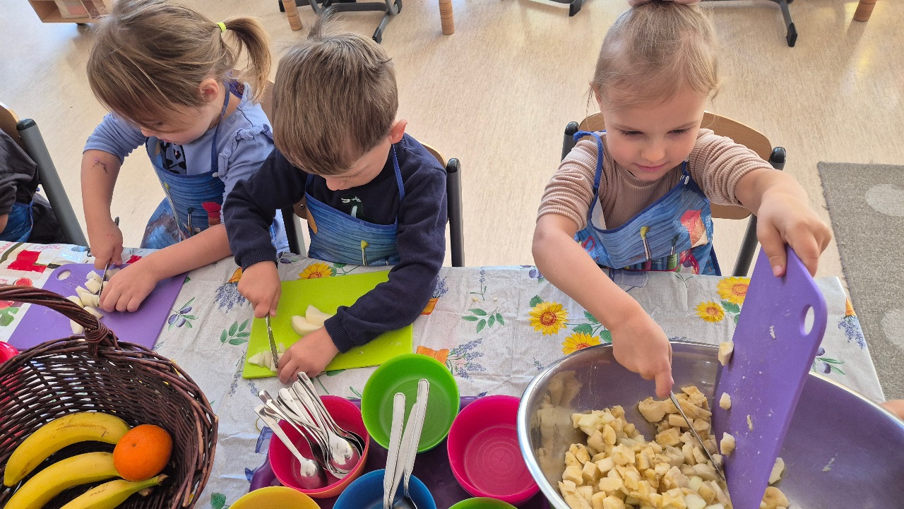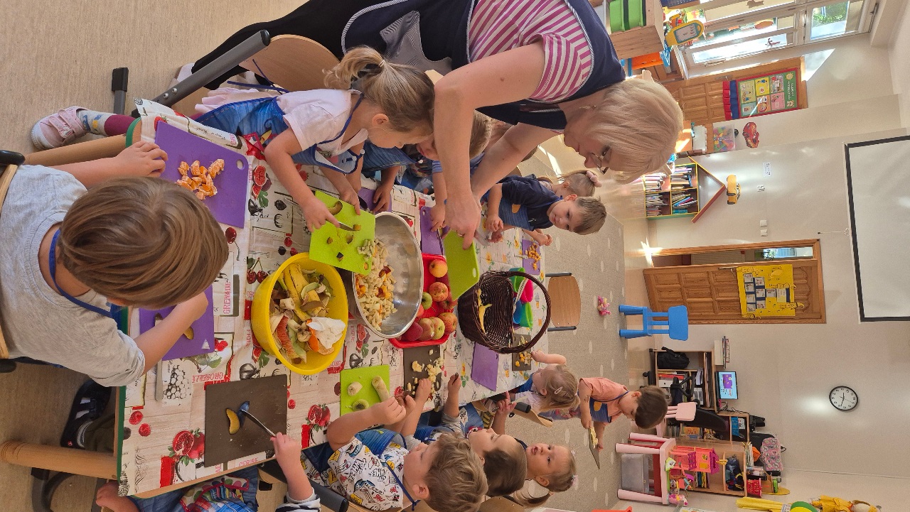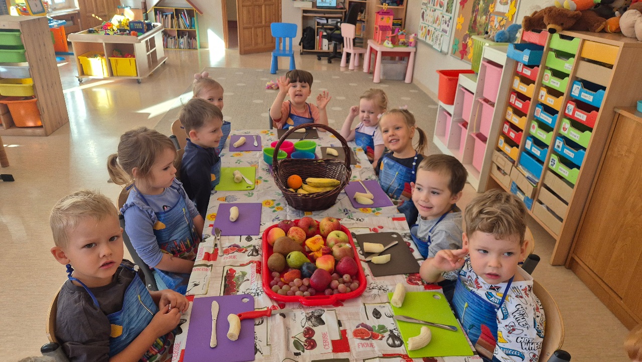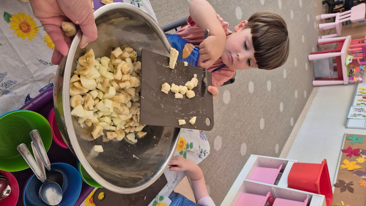 Nasze chochlikowe przedszkolaki zamieniły się w prawdziwych małych kucharzy. Podczas zajęć kulinarnych dzieci z wielkim zaangażowaniem przygotowywały pyszną i zdrową sałatkę owocową. Na początku dzieci zapoznały się z przyniesionymi owocami – wspólnie rozpoznawaliśmy ich nazwy, kolory, kształty i zapachy. Wśród owoców znalazły się m.in.: jabłka, gruszki, banany, winogrona, śliwki i mandarynki. Każdy przedszkolak miał okazję dotknąć i powąchać owoce, a także wypowiedzieć się, które z nich najbardziej lubi. Po umyciu rąk i założeniu fartuszków, dzieci przystąpiły do krojenia przygotowanych owoców (oczywiście z pomocą nauczycieli i przy użyciu bezpiecznych nożyków). Wszystkie pokrojone owoce zostały wrzucone do jednej dużej miski, a następnie delikatnie wymieszane. Na zakończenie nastąpił najprzyjemniejszy moment – degustacja. 😋 Dzieci ze smakiem zjadły własnoręcznie przygotowaną sałatkę, poznając nie tylko nowe smaki, ale także ucząc się zasad zdrowego odżywiania. Zajęcia kulinarne były nie tylko doskonałą zabawą, ale również: rozwijały samodzielność i współpracę w grupie, uczyły dbania o higienę i bezpieczeństwo w kuchni, wzbogacały wiedzę o owocach i zdrowym stylu życia. To była pyszna i zdrowa lekcja, która wszystkim bardzo się podobała!
