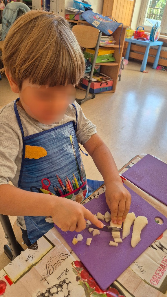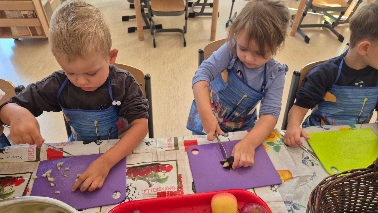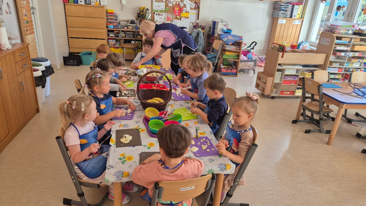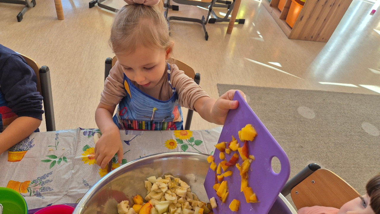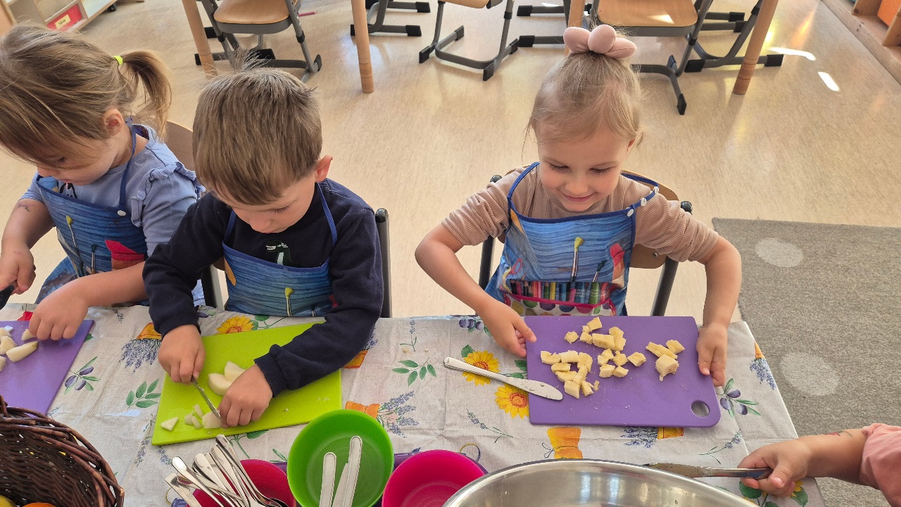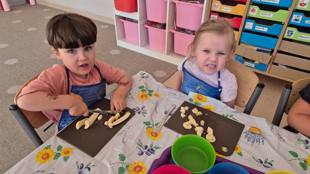 Nasze chochlikowe przedszkolaki zamieniły się w prawdziwych małych kucharzy. Podczas zajęć kulinarnych dzieci z wielkim zaangażowaniem przygotowywały pyszną i zdrową sałatkę owocową. Na początku dzieci zapoznały się z przyniesionymi owocami – wspólnie rozpoznawaliśmy ich nazwy, kolory, kształty i zapachy. Wśród owoców znalazły się m.in.: jabłka, gruszki, banany, winogrona, śliwki i mandarynki. Każdy przedszkolak miał okazję dotknąć i powąchać owoce, a także wypowiedzieć się, które z nich najbardziej lubi. Po umyciu rąk i założeniu fartuszków, dzieci przystąpiły do krojenia przygotowanych owoców (oczywiście z pomocą nauczycieli i przy użyciu bezpiecznych nożyków). Wszystkie pokrojone owoce zostały wrzucone do jednej dużej miski, a następnie delikatnie wymieszane. Na zakończenie nastąpił najprzyjemniejszy moment – degustacja. 😋 Dzieci ze smakiem zjadły własnoręcznie przygotowaną sałatkę, poznając nie tylko nowe smaki, ale także ucząc się zasad zdrowego odżywiania. Zajęcia kulinarne były nie tylko doskonałą zabawą, ale również: rozwijały samodzielność i współpracę w grupie, uczyły dbania o higienę i bezpieczeństwo w kuchni, wzbogacały wiedzę o owocach i zdrowym stylu życia. To była pyszna i zdrowa lekcja, która wszystkim bardzo się podobała!