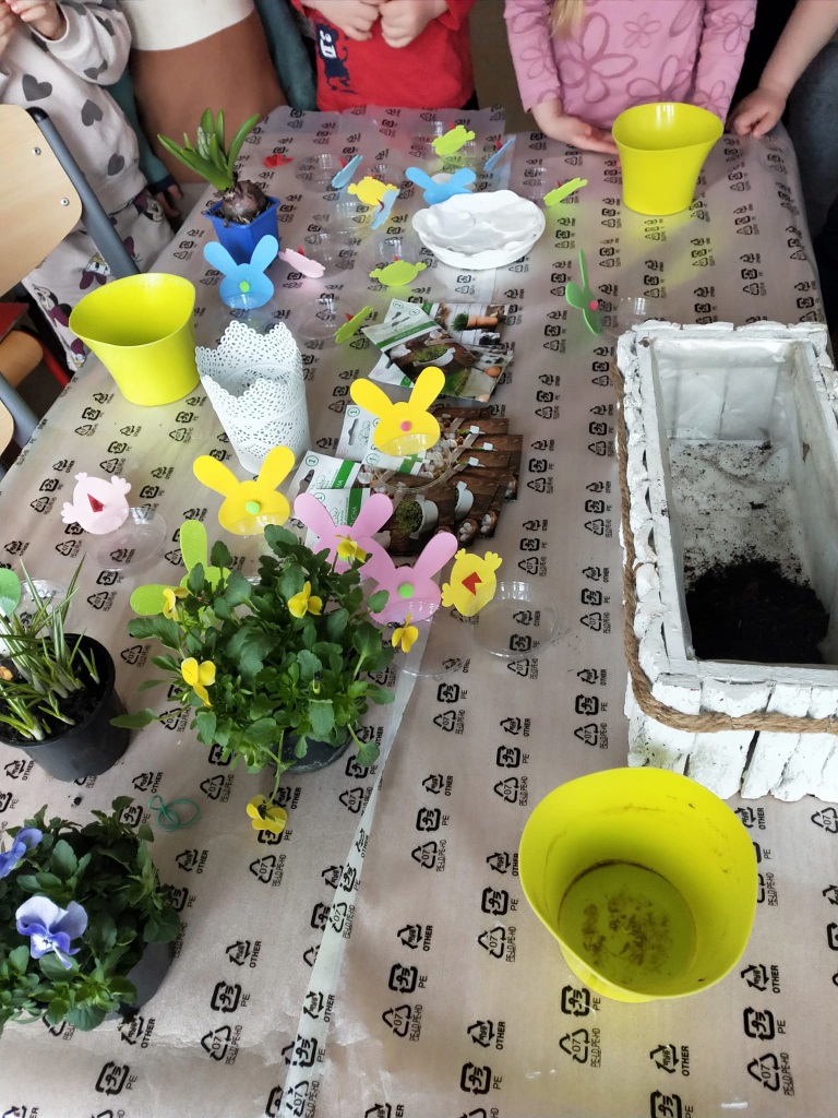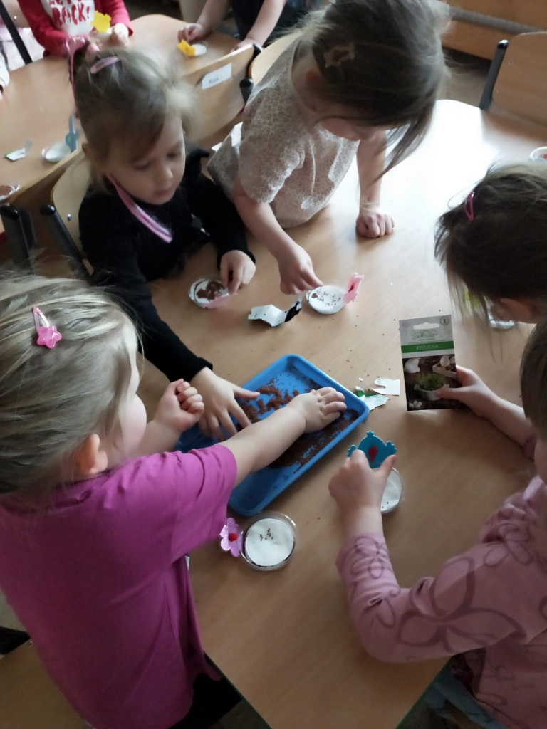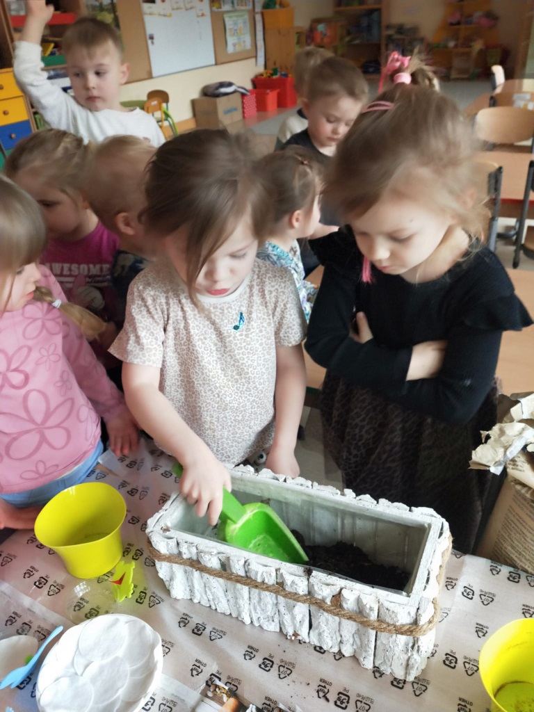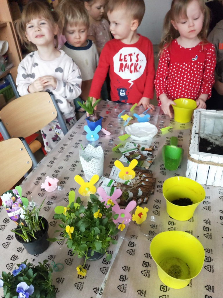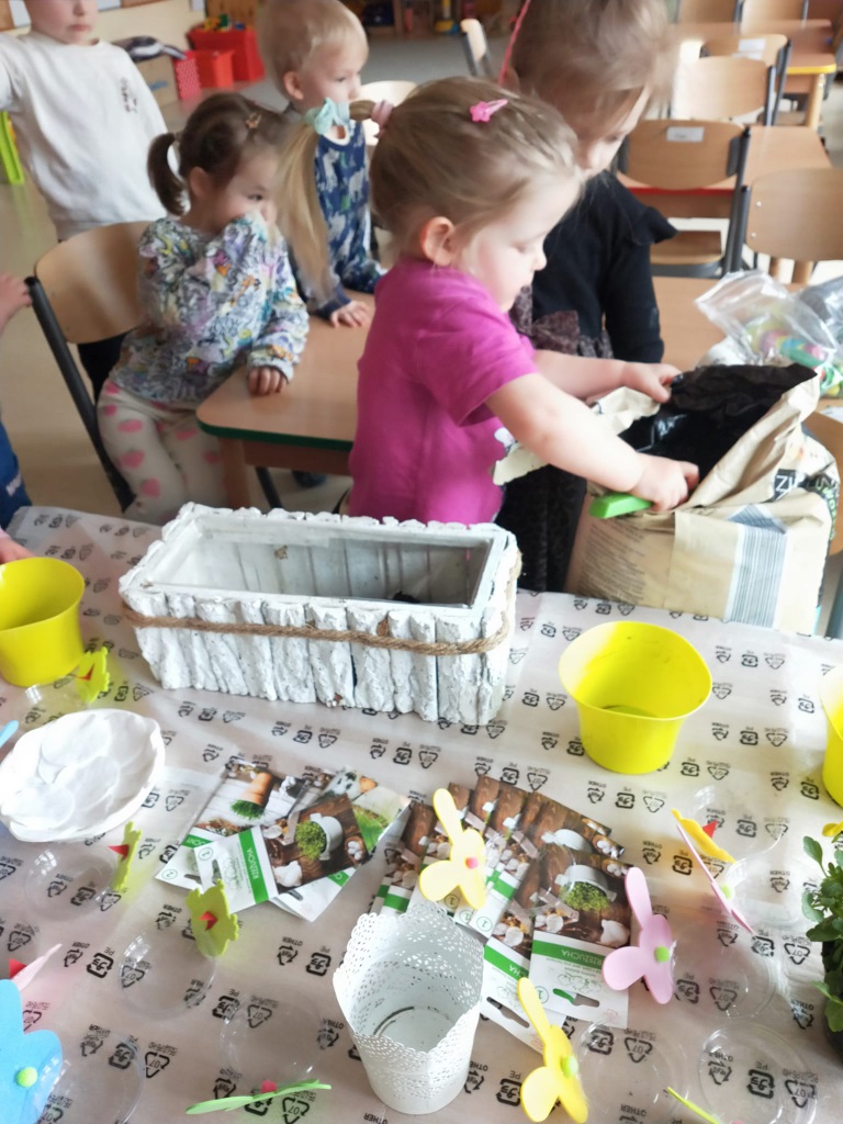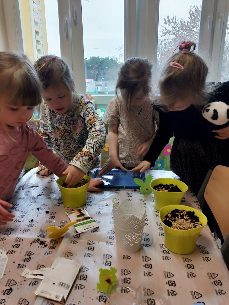 Czekając na wiosnę, Krasnoludki ozdobiły swoją sale wiosennym ogródkiem. Sadzeniu i sianiu nie było końca. Dzieci pracowały dzielnie i w pełnym skupieniu, zapraszając do sali Panią Wiosnę.