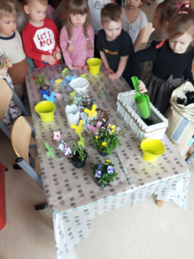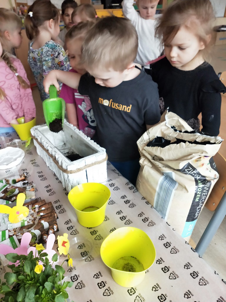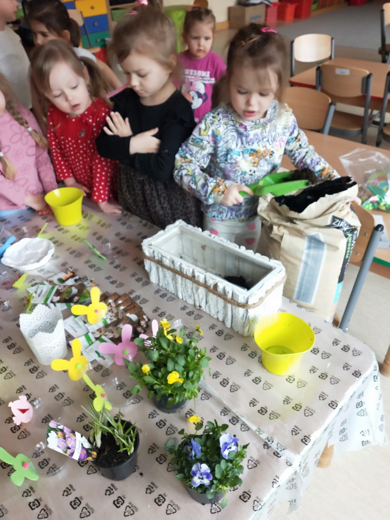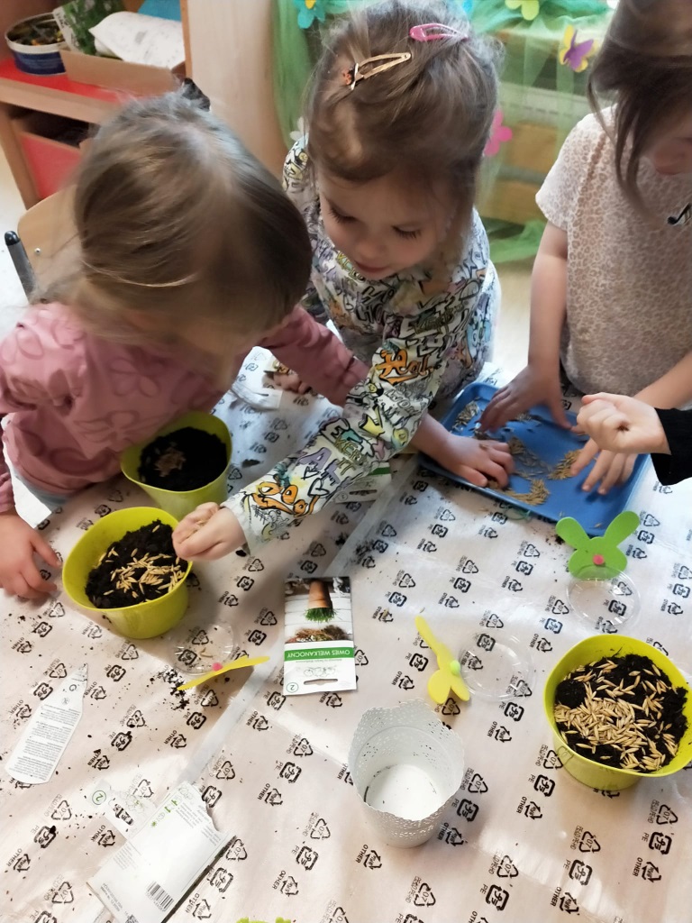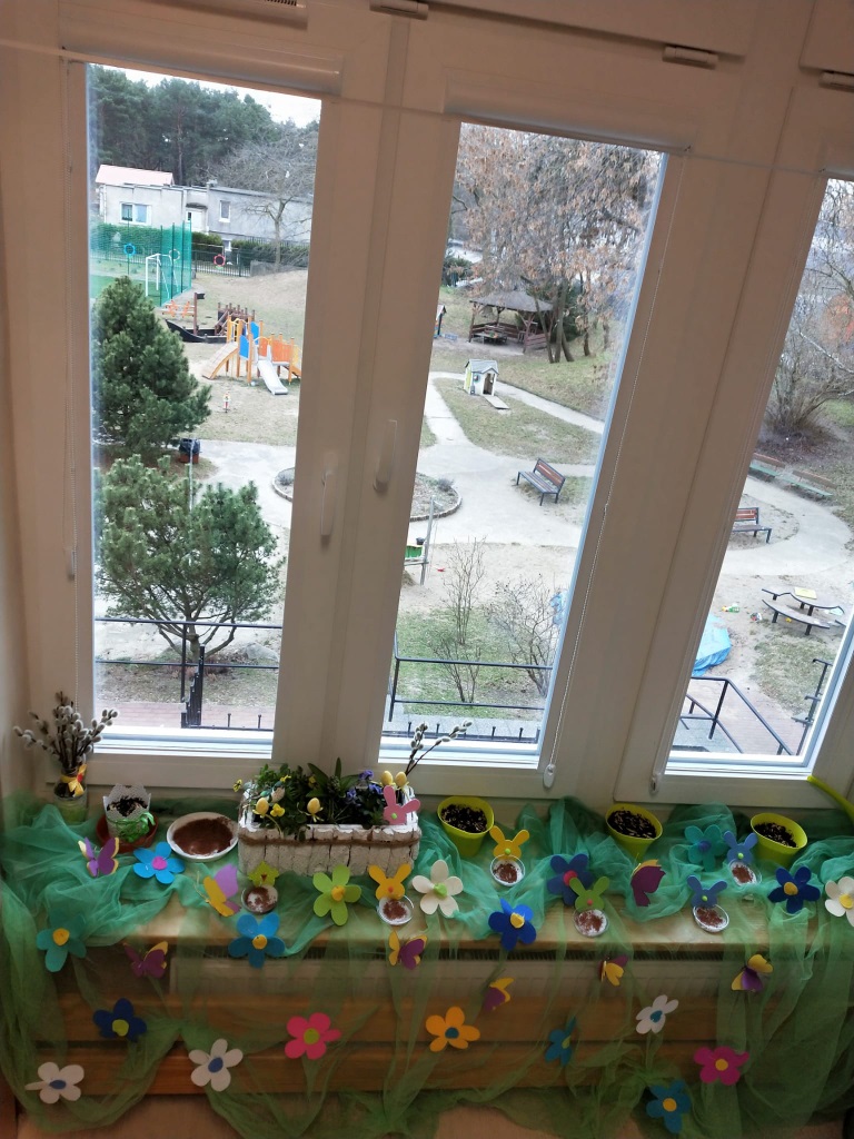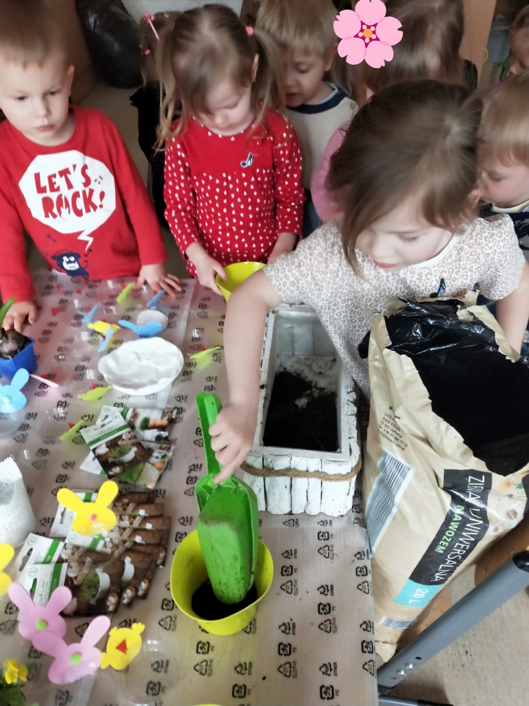 Czekając na wiosnę, Krasnoludki ozdobiły swoją sale wiosennym ogródkiem. Sadzeniu i sianiu nie było końca. Dzieci pracowały dzielnie i w pełnym skupieniu, zapraszając do sali Panią Wiosnę.