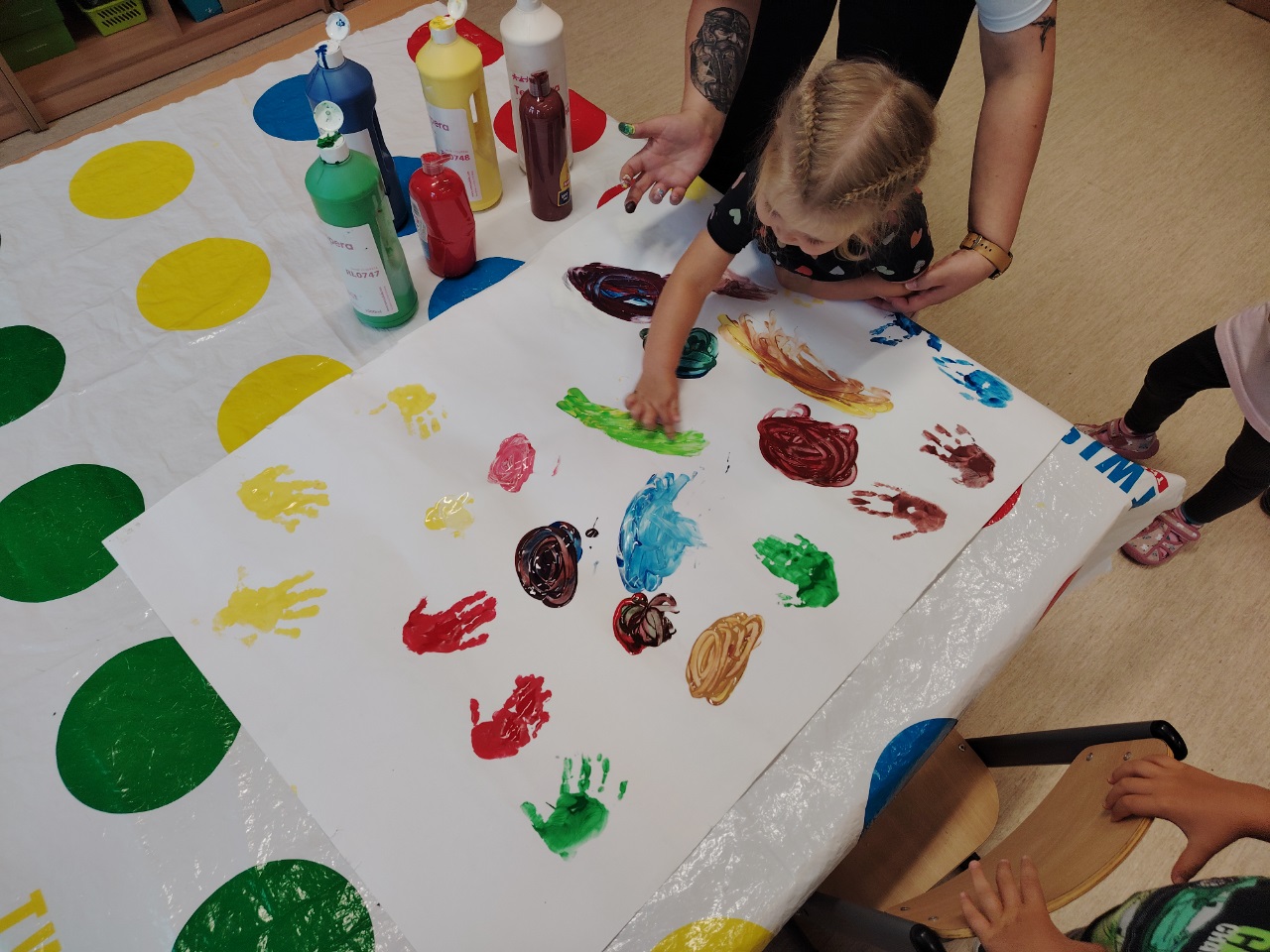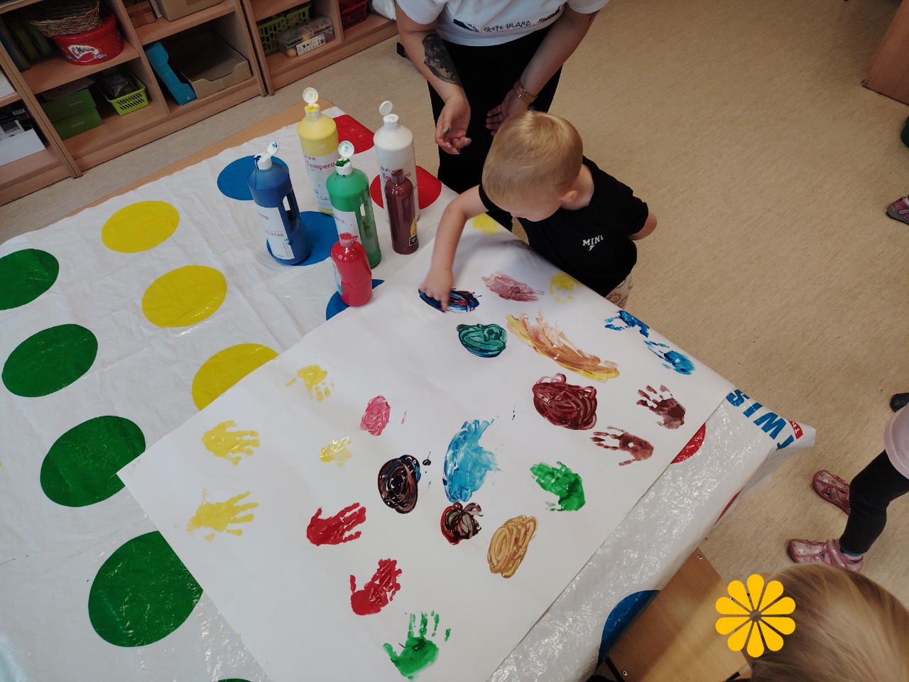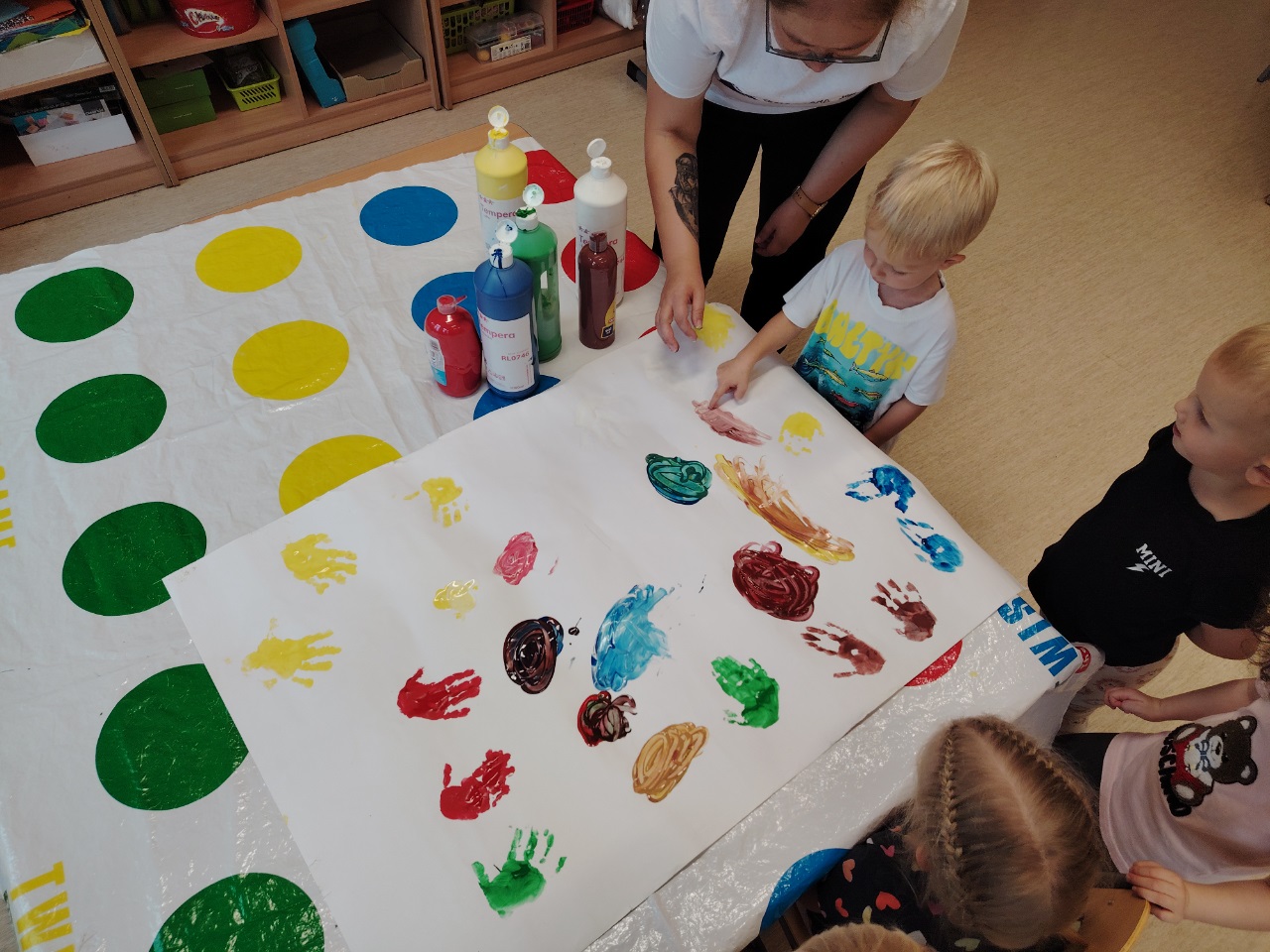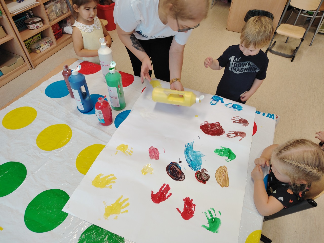 W ostatnim tygodniu podczas zabawy farbami krasnoludki odkrywały co się stanie jak połączymy swoje ulubione kolory. Testowaliśmy jaka w dotyku jest farba, czy ilość farby ma znaczenie oraz jak długo schnie praca. Wszyscy mieliśmy dużo dobrej zabawy.