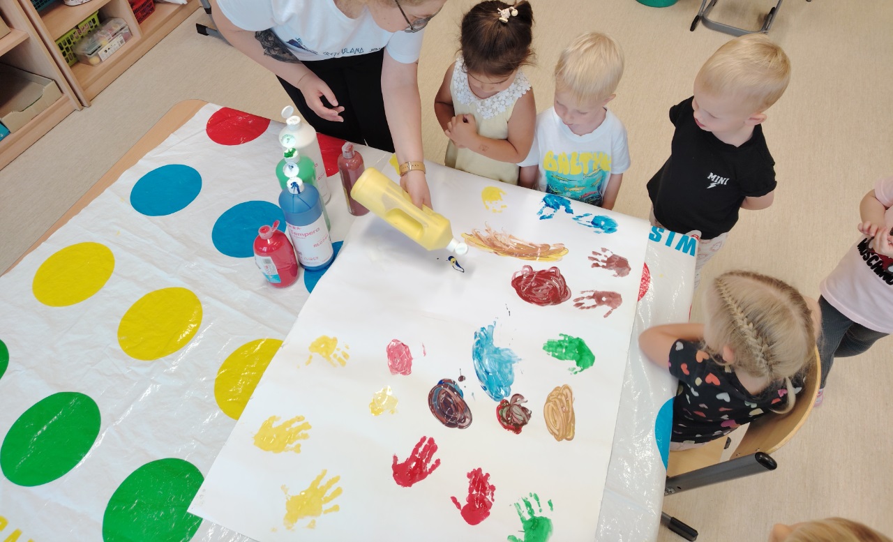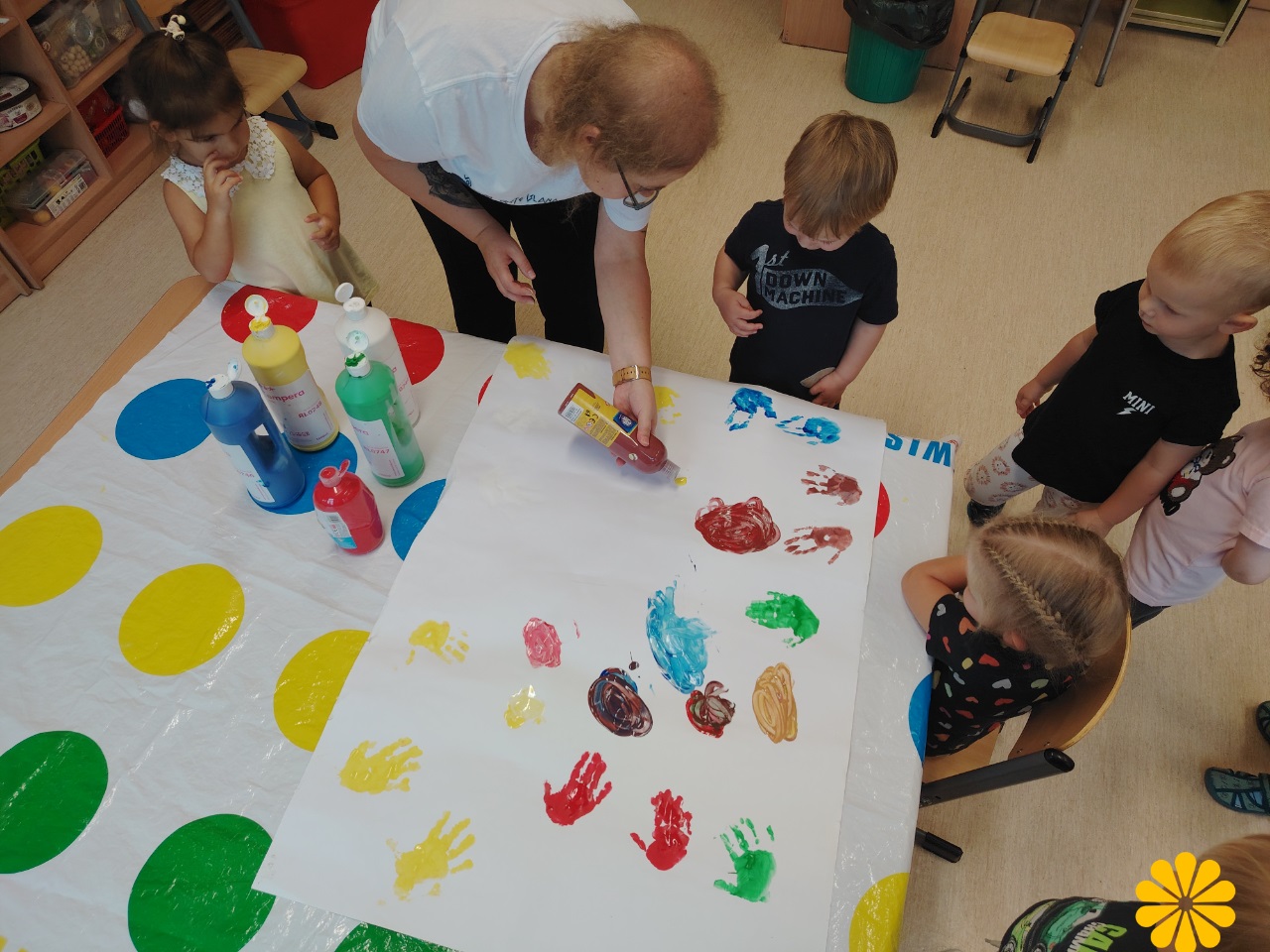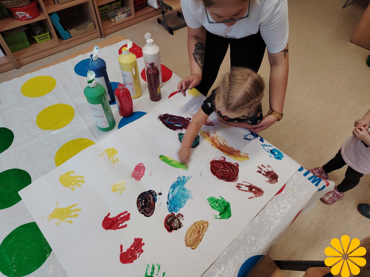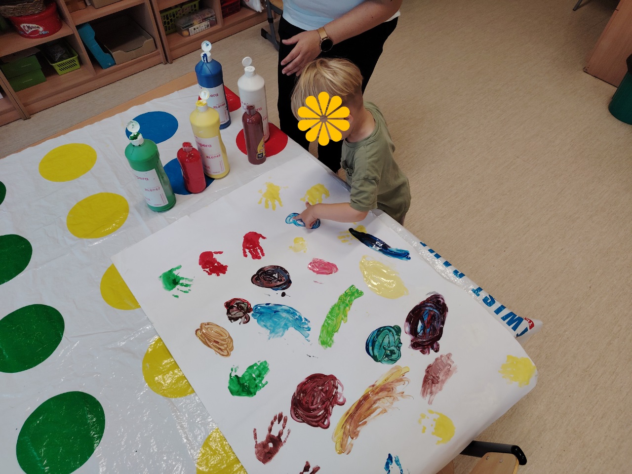 W ostatnim tygodniu podczas zabawy farbami krasnoludki odkrywały co się stanie jak połączymy swoje ulubione kolory. Testowaliśmy jaka w dotyku jest farba, czy ilość farby ma znaczenie oraz jak długo schnie praca. Wszyscy mieliśmy dużo dobrej zabawy.