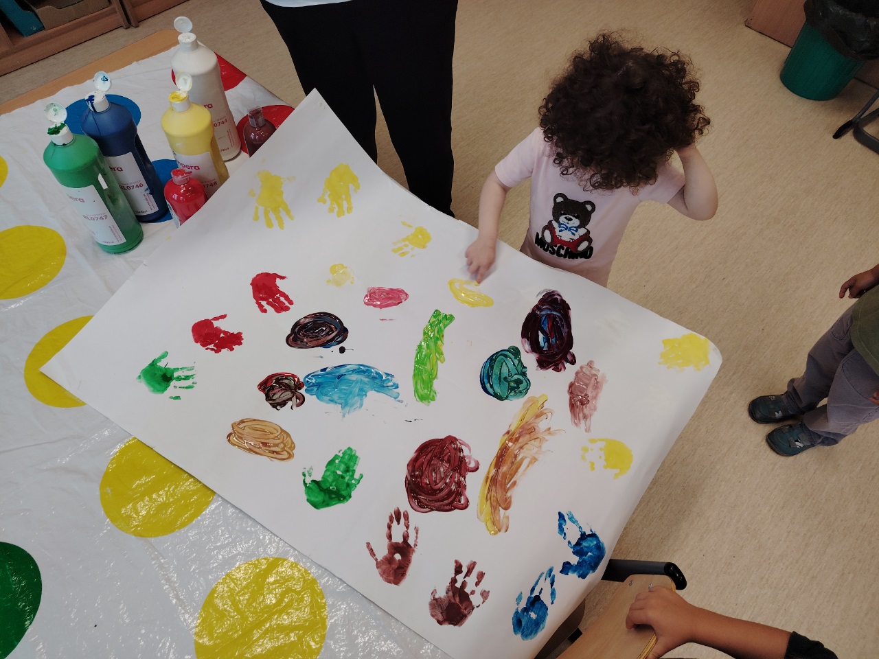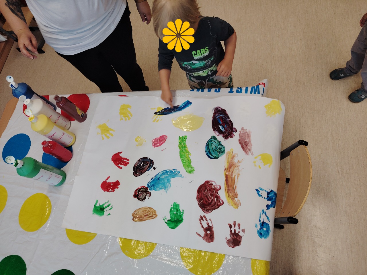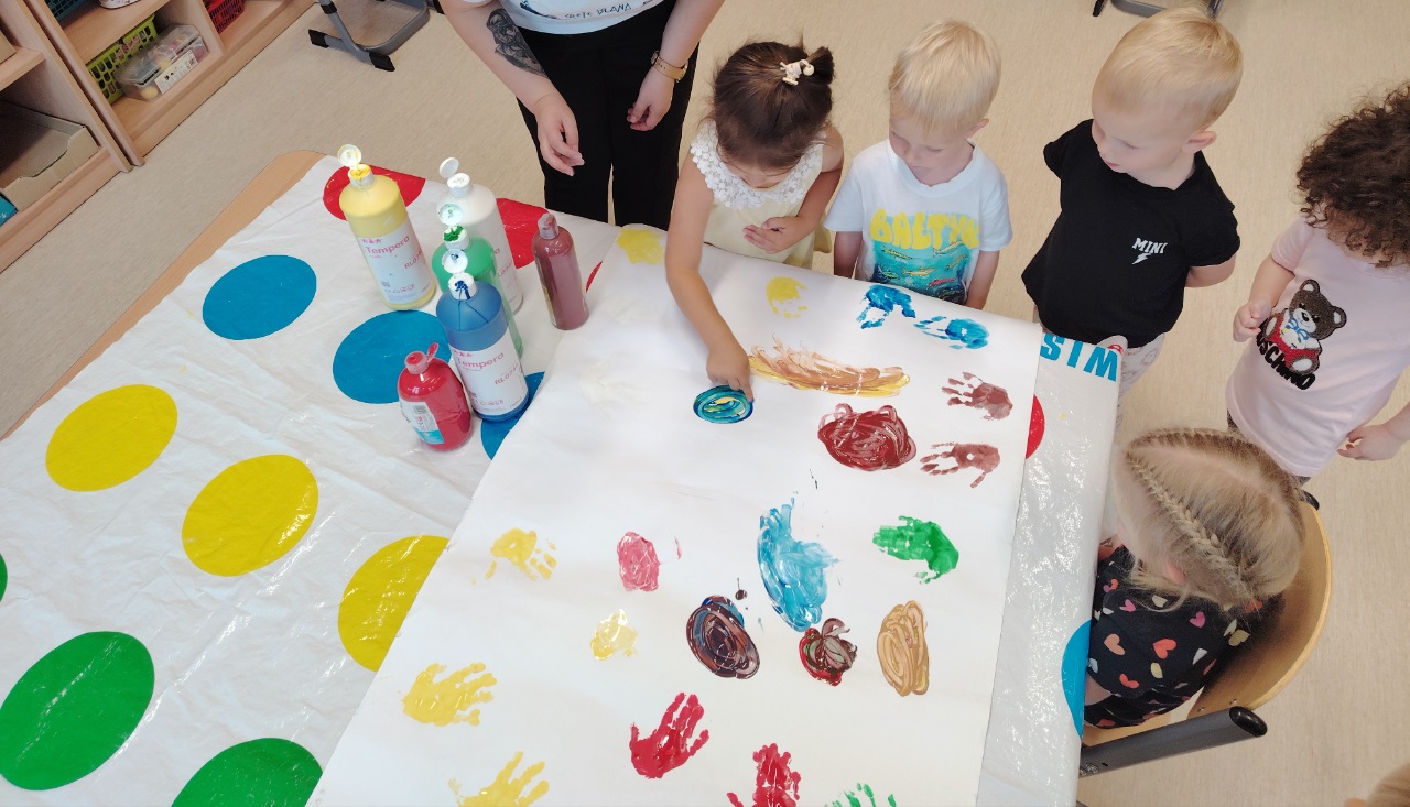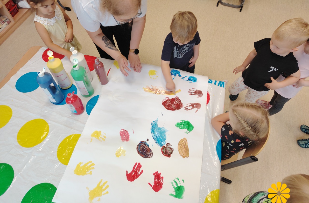 W ostatnim tygodniu podczas zabawy farbami krasnoludki odkrywały co się stanie jak połączymy swoje ulubione kolory. Testowaliśmy jaka w dotyku jest farba, czy ilość farby ma znaczenie oraz jak długo schnie praca. Wszyscy mieliśmy dużo dobrej zabawy.