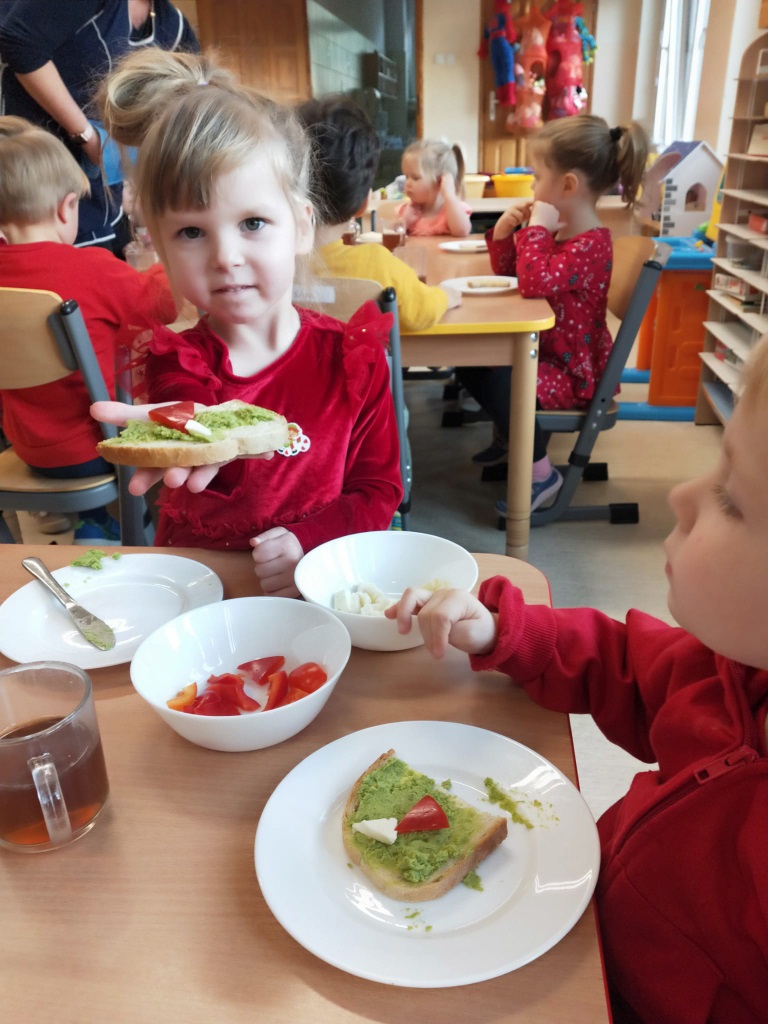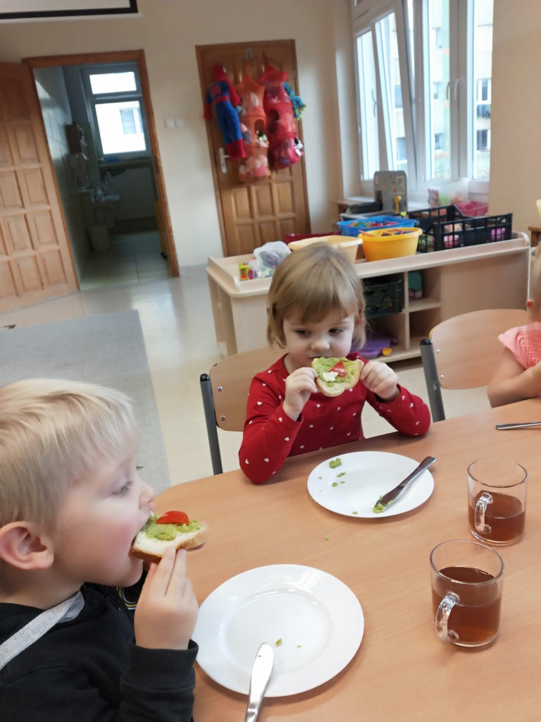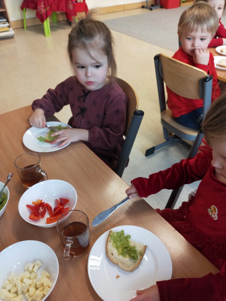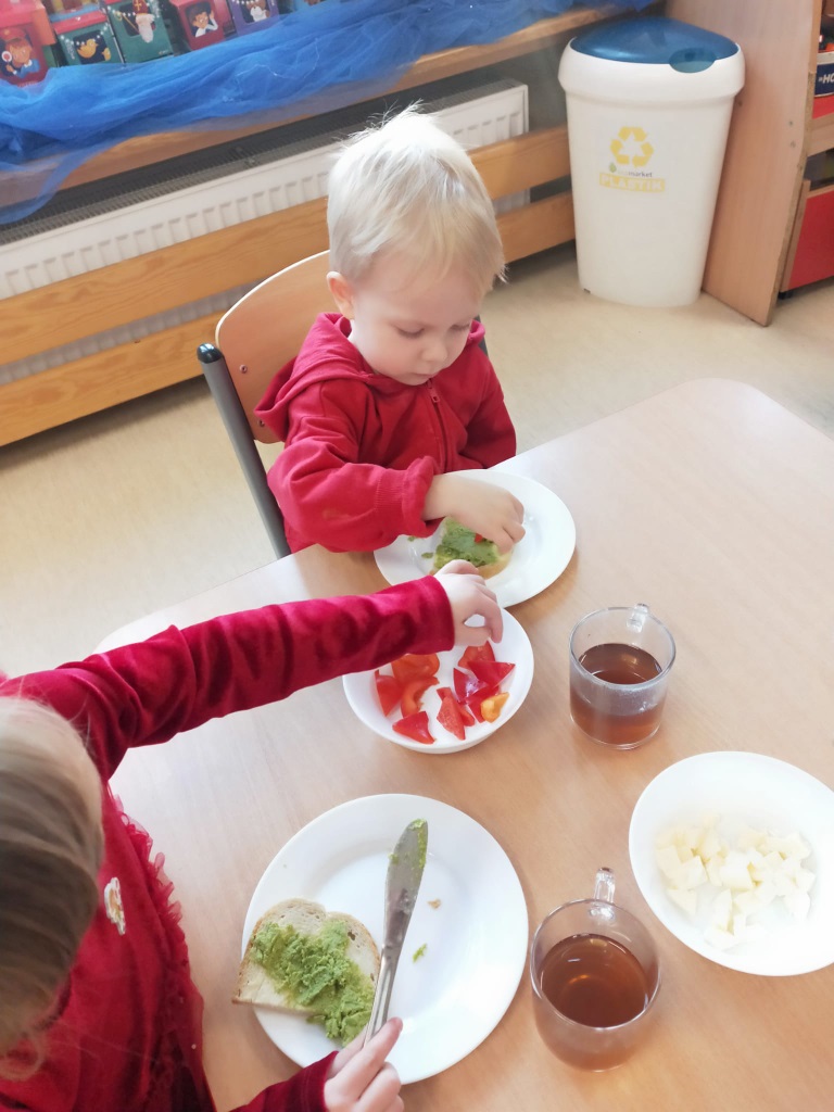 We wtorek 9.12 Krasnoludki stworzyły niesamowite kanapki. Podczas podwieczorku nie tylko ćwiczyły samodzielne smarowanie kanapek ale także dekorowały je smacznym czapeczkami. Kanapki były kolorowe, pełne zdrowia i witamin, ale co najważniejsze dumy z samodzielnie przygotowanego posiłku.